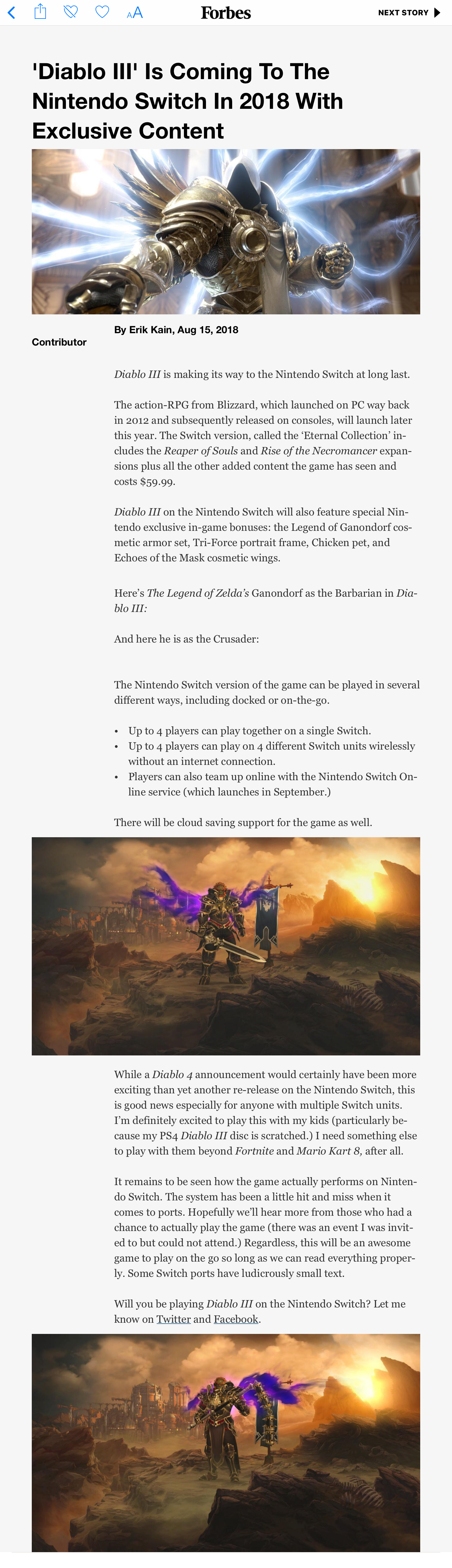 The Legend of Zelda: косметическую броню «Легенда Ганондорфа», рамку для портрета «Трифорс», ручное животное в виде курицы и косметические крылья «Эхо Маски». Forbes даже приводит скриншоты с бонусными предметами, которые надеты на варвара и крестоносца.