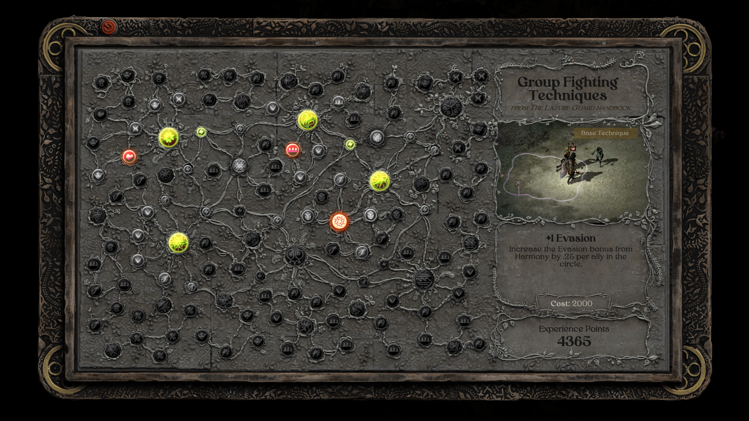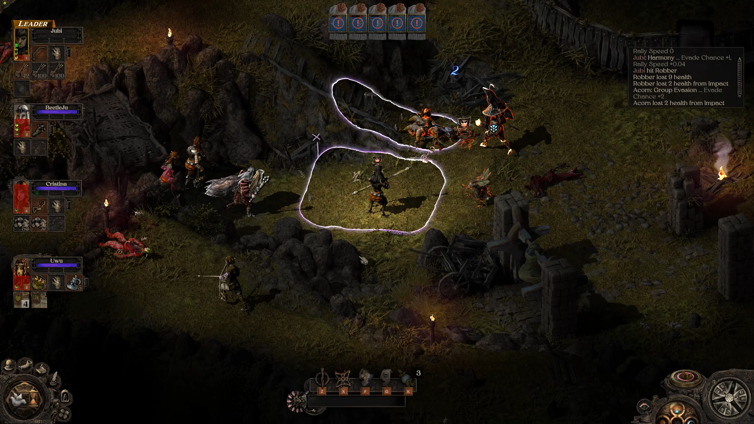 С прокачкой открываются и другие навыки. Например, построение отряда — на скриншотах оно обозначено белым полем. Когда глава отряда задаёт область, остальная команда забегает внутрь, где будет получать бонусы за каждого союзника. Особенно удобно использовать построения в узких проходах — пока воин держит оборону, другие могут спокойно обстреливать толпу с безопасного расстояния. Тут и пригодится алхимик с бомбами — в обычном бою он частенько будет промахиваться по подвижным целям.