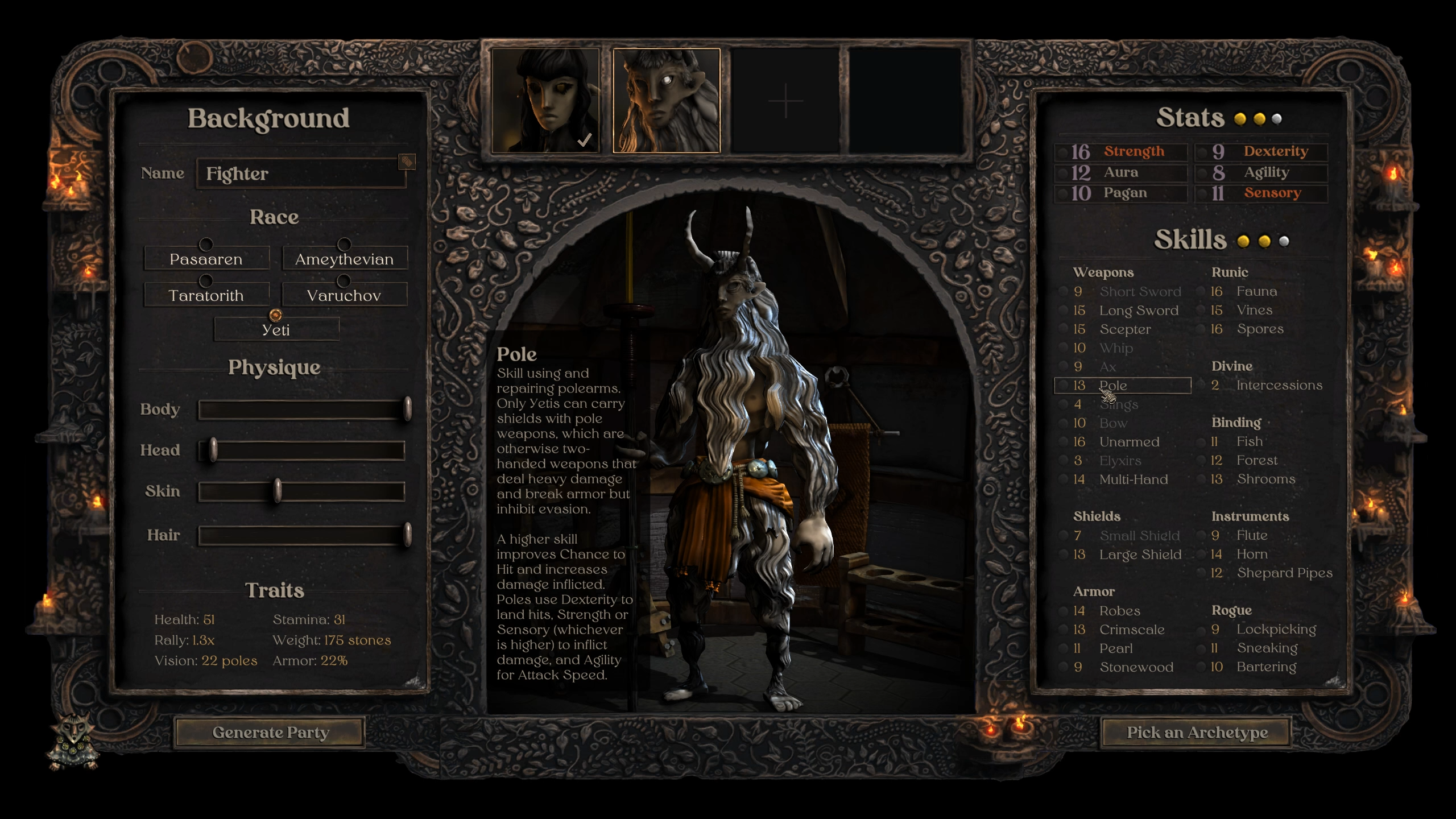 На выбор доступно пять рас: пасаарены — ловкие и сильные жители джунглей с птичьими лапами; скрытные варуховы, которые живут в пещерах; огромные рогатые йети, способные держать в своих лапищах только большое оружие; тараториты, обладатели змеиных кос; и аметиванцы, водные существа с перепонками и фиалковой кожей.