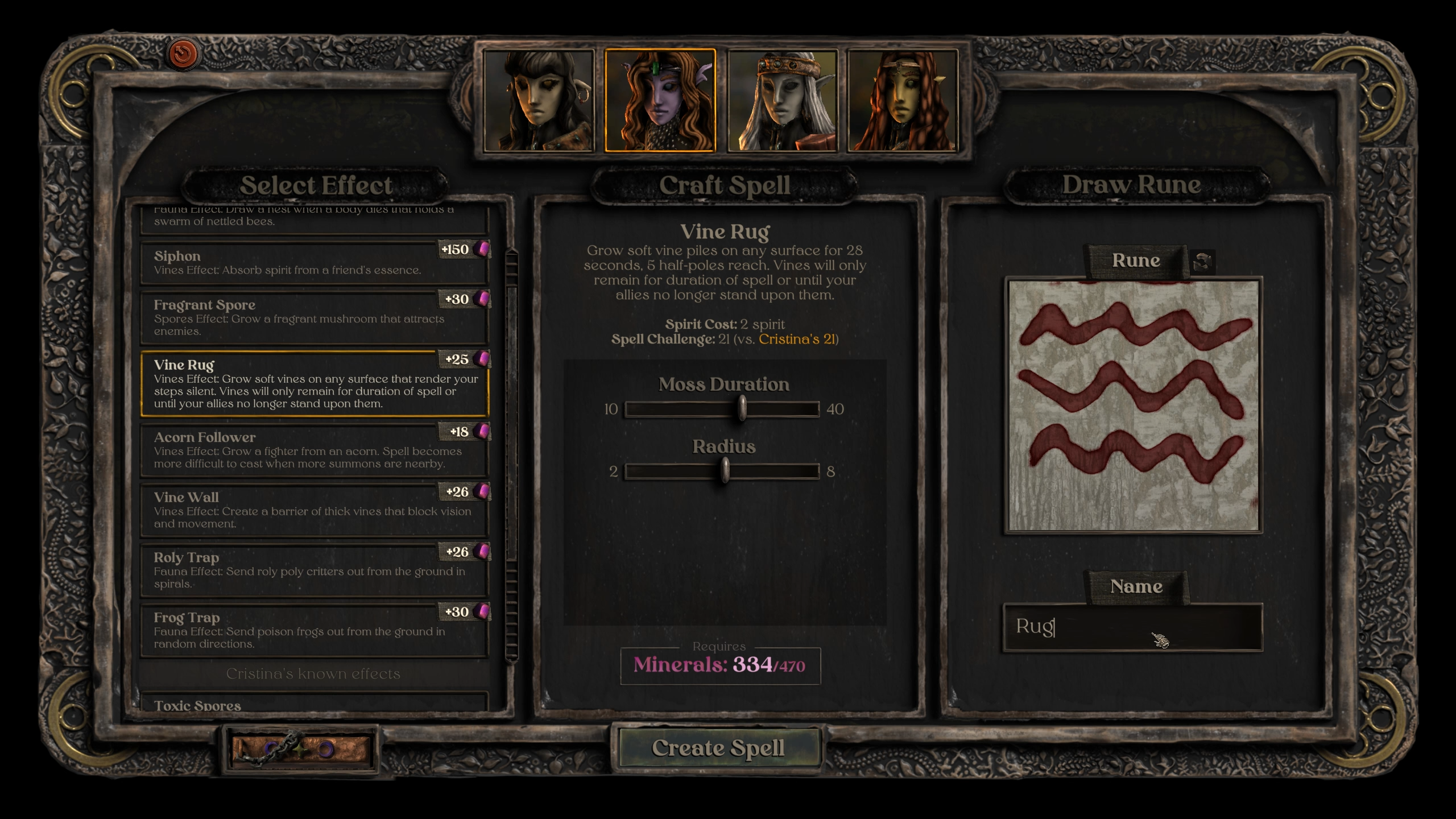 У особых деревьев маги могут создавать уникальные заклинания — самостоятельно выбирать урон, площадь и продолжительность эффектов. На это расходуется специальная валюта — её можно добыть, смолов в ступке различные минералы. Другие персонажи создают расходники самостоятельно. Лучник умеет крафтить стрелы из металла и дерева, которое собирает в лесу, а алхимик запросто сделает бомбу из спиртных напитков. Всё это также можно купить в магазине, но умелый стражник всегда сэкономит и обворует кого-нибудь по пути!