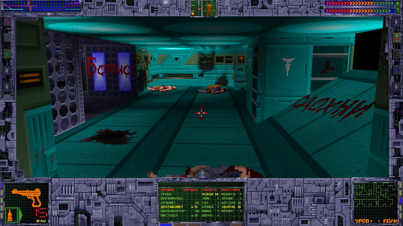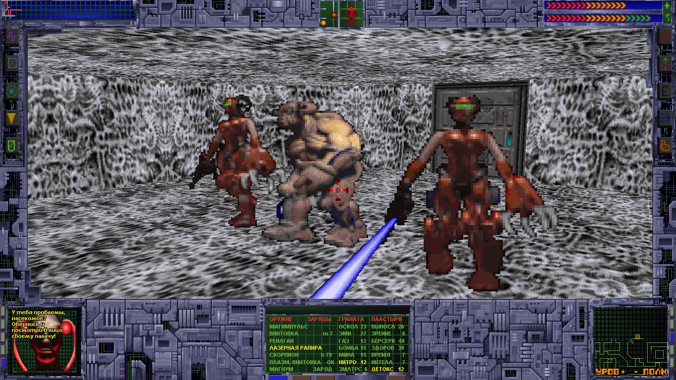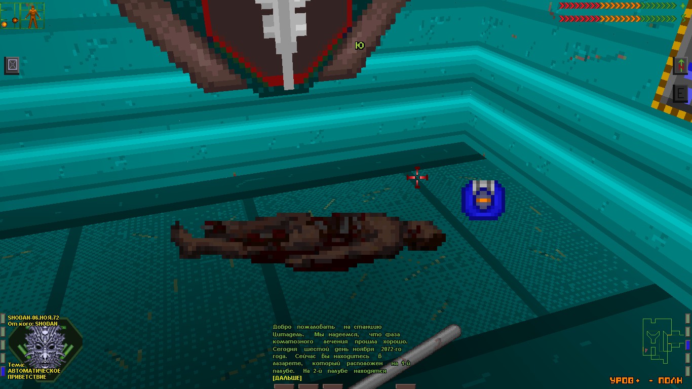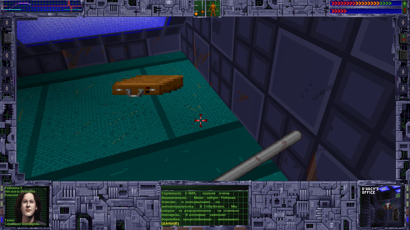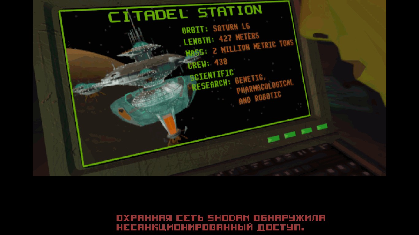 И заодно позволяет воспринимать игру как более свежий и актуальный продукт, а не застывший артефакт своей эпохи. Забавно, что многие вспоминают о том, как же крут был местный ИИ SHODAN в роли главной злодейки игры. Да может взаимодействие с ней и дарит целый спектр эмоций по мере прохождения, но это скорее главная звезда сцены на арене цирка. Воспринимать антагониста в качестве зла мешает тот простой факт, что это просто сверхсложная программа, которую мы сами и поломали. Если здесь и есть, какой злодей так разве прогнивший корпорат Диего. А SHODAN мне по ходу игры было даже в чём-то жаль — бедная поломанная игрушка, инструмент в результате ошибки возомнивший себя богом. Разве что не хватает чуть более личного участия и хоть какой-то реакции от всего происходящего от главного героя. Я всё понимаю — молчаливые парни тогда были в моде, но в самом начале игры можно найти заметку-дневник от самого хакера. Я уж было решил, что через текст дневника герой будет раскрывать свою личность и отношение ко всему творящемуся на станции, но обломился, ибо эта заметка оказалась единственной за всю игру. Так что не хватает местному протагонисту хоть какой-то личности, кроме шила в заднице.