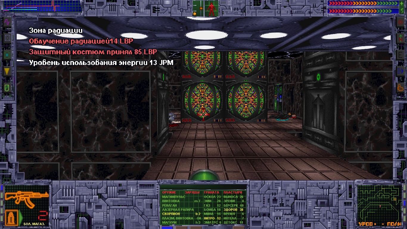 Отдельных слов заслуживает местный интерфейс. Пусть в своё время остряки и называли System Shock шутером с управлением как из кабины пилота, но на деле всё оказалось несколько по-другому. Да значительную часть экрана занимает интерфейс пытающийся отобразить буквально все аспекты управления в игре, но, во-первых он отключается в довольно стильный фуллскрин по нажатию одной кнопки, а во-вторых он на самом деле удобен. Конечно, интерфейс достаточно нагружен функционалом, но лучше уж такое управление, чем некоторые менюшки, подменюшек с десятками окошечек, где запутаться проще, чем в чужом городе. А уж учитывая, то, что изрядная часть игроков играет и так в оконных режимах, то жаловаться на малое поле обзора просто грешно. В конце концов, кто бы, что не говорил о переусложнённом интерфейсе игры, но ему очень далеко до различных MMO, у которых интерфейс зачастую больше напоминает пульт управления Атомной станцией. А ведь в них играют миллионы и как-то не жалуются. Я например редко врубал фуллскрин просто потому, что с интерфейсом было проще манипулировать лутом и ориентироваться по карте, ну и более узкое поле зрения помогало мне в пиксельхантинге.