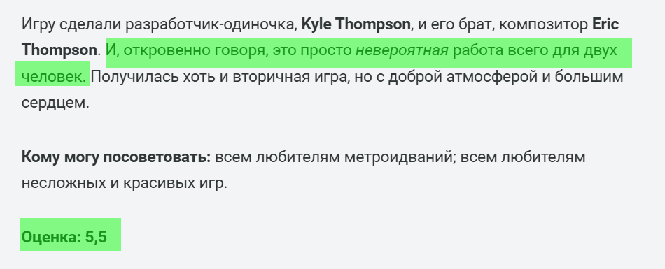 Игру сделали разработчик-одиночка, Kyle Thompson, и его брат, композитор Eric Thompson. И, откровенно говоря, это просто невероятная работа всего для двух человек. Получилась хоть и вторичная игра, но с доброй атмосферой и большим сердцем.