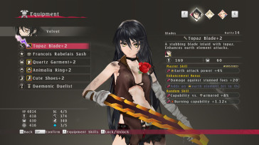 Наша главная героиня – Велвет, в ходе завязки истории, о которой чуть позже, становится особым демоном – терионом, со способностью вызывать демоническую руку. Боевая система построена на цепочке ударов, которые вы сами назначаете на каждую кнопку. Каждый удар имеет свою стихию, а также эффективен против разных типов врагов, аля один больнее бьёт по ползучим, другой по летающим и тд. Но резист к стихиям важнее, ибо он позволяет стагерить врага, и увеличивает шанс наложения дебафов.