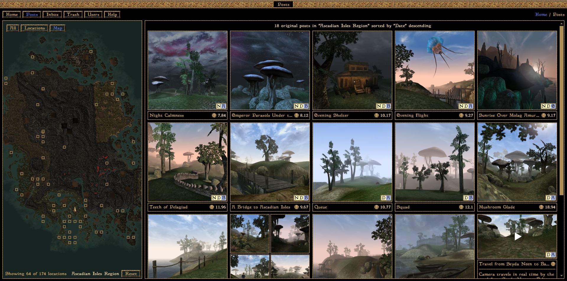 Моя особая гордость — интерактивная карта Вварденфелла, по которой можно кликать и смотреть скриншоты из конкретных локаций. К сожалению, многие старые посты пока не размечены локациями, но каждый желающий может с помощью кнопки на сайте подсказать, где мог быть снят соответствующий кадр.