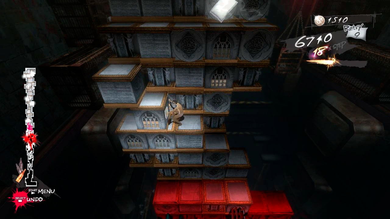 А вот ночью, когда Винсент идёт домой и ложится спать, стартует основной геймплей Catherine. Его суть заключается в том, что каждый раз главному герою снится один и тот же кошмар, где он с рогами и в одних семейках забирается на постепенно рушащуюся стену из кубов, пытаясь добраться до самой вершины — тут прослеживается достаточно очевидная метафора преодоления жизненных трудностей, сопутствующих не только налаживанию семейных отношений, но и обретению жизненного баланса вообще. Игроку, в свою очередь, дозволено делать с кубами что угодно: толкать, тянуть, взбираться на них, а также свисать с их краёв. И, собственно, именно на этих действиях весь игровой процесс и завязан. Причём, несмотря на ограниченный арсенал способностей протагониста, у разработчиков, по моему мнению, получилось создать весьма глубокую и занимательную головоломку. Да, поначалу, пока ты ещё не до конца приловчился к центральным механикам, придётся немного туго, но уже потом, освоив ключевые приёмы восхождения на вершину, втягиваешься в процесс и начинаешь получать удовольствие.