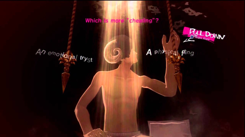 Да и вообще Catherine поднимает весьма широкий спектр щепетильных тем: возможность трансформации любви во взаимные обязательства, неизбежность ответственности за собственные поступки, необходимость жертвовать чем-то во имя будущего, неопределённость этого будущего в целом и много чего ещё. И все они раскрываются через призму человеческих отношений, которые, разумеется, никак не могут быть идеальными. Оказывается, простое «и жили они долго и счастливо» встречается в жизни не настолько часто, как хотелось бы, поскольку разногласия, недопонимания и ссоры — неотъемлемая часть совместной жизни. И ты их либо преодолеваешь путём совместных усилий с партнёром, либо заканчиваешь отношения со словами вроде «ну, не сошлись характерами» и начинаешь другие, либо попросту остаёшься один. Именно эта дилемма представлена в игре, причём «правильность» или «неправильность» принятых решений игрок определяет для себя сам: в зависимости от сделанного выбора вы получите какую-то из множества концовок, и среди них нет ни одной с однозначно негативной оценочной окраской. Если вам ближе остепенившаяся любовь с прогнозируемым будущим, то вы сохраняете отношения с первой Кэтрин (Katherine). Если вы желаете будоражащего хаоса и страсти, наполненной риска, то сближаетесь со второй Кэтрин (Catherine). А если вы просто хотите послать всё куда подальше и в кои-то веки пожить только для себя, то вас никто не остановит.