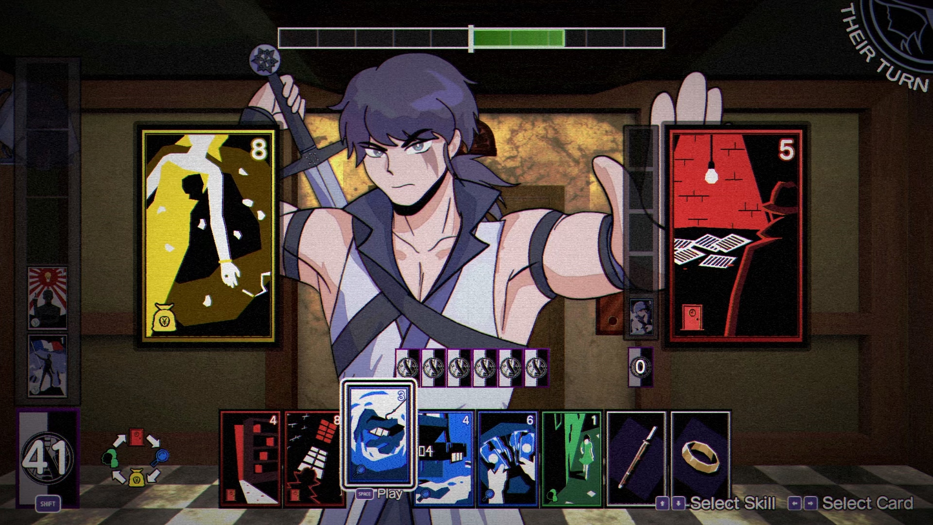 Звучит несложно, но в ход врубаются так любимые картёжниками «нюансы». Так, использование сильной масти против слабой как бы «пробивает её», открывая поле для наворачивания комбо. А ещё карты бывают разных достоинств: от 1 до 9, и если вы не бьёте карту оппонента той мастью, к которой она уязвима, то понадобится ещё превозмочь её по значению, иначе выйдет пшик в воздух и потеря хода. Но карты со слишком большим числом тоже опасны, потому что 8 и 9 гасятся картой с достоинством 1. Уже всего этого мне оказалось достаточно для того, чтобы схватиться за голову.
