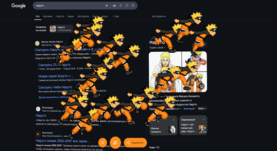 Например всеми известный Google зачастую добавляет различные интересные фишки при разных запросах. Так недавно при поиске Naruto, можно было создать множество теневых клонов, для этого требовалось всего лишь нажать кнопку появляющееся на экране.