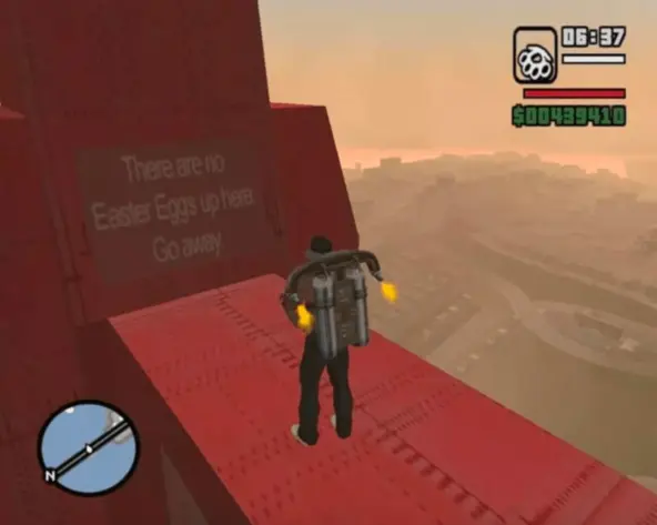 Еще очень часто разработчики при добавление секретов какими-либо способами шутили над игроками. Так например в легендарной GTA: San Andreas если игроку удастся забраться на труднодоступную площадку на опоре моста, то увидит надпись: «There are no Easter Eggs up here. Go away» («Здесь нет пасхальных яиц. Уходи отсюда»).