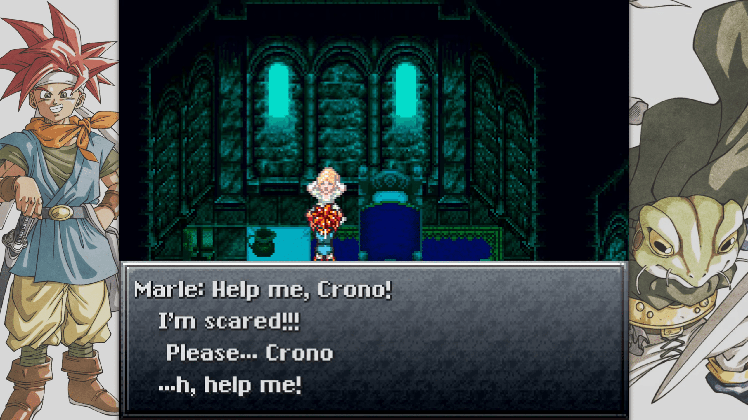 К счастью, процедура публичного превращения в поток частиц прошла без негативных последствий — к изумлению толпы и новообретённой подружки Марл, с которой Кроно буквально встретился лбом. Последняя тут же загорелась желанием повторить подвиг главного героя, запрыгнула в телепод, и... Вы поняли верно. Что-то пошло не так. Кулон Марл начинает отчего-то сиять, и процесс телепортации завершается открытием межпространственных врат, в которые девушку и засасывает. Толпа в шоке, батька Лукки в шоке, сама Лукка... В принципе, тоже в шоке, но так же и в режиме: «ох ты ж как любопытно эксперимент обернулся, надо обязательно изучить». Один Кроно не в шоке, чай нем как рыба, так что он молча хватает кулон, оставшийся от девушки, которую знает несколько минут, врубает главную музыкальную тему игры и всем своим видом такой: «мать, заводи машину, я на выручку». Ну и прыгает в пространственно-временную штуку навстречу судьбе.