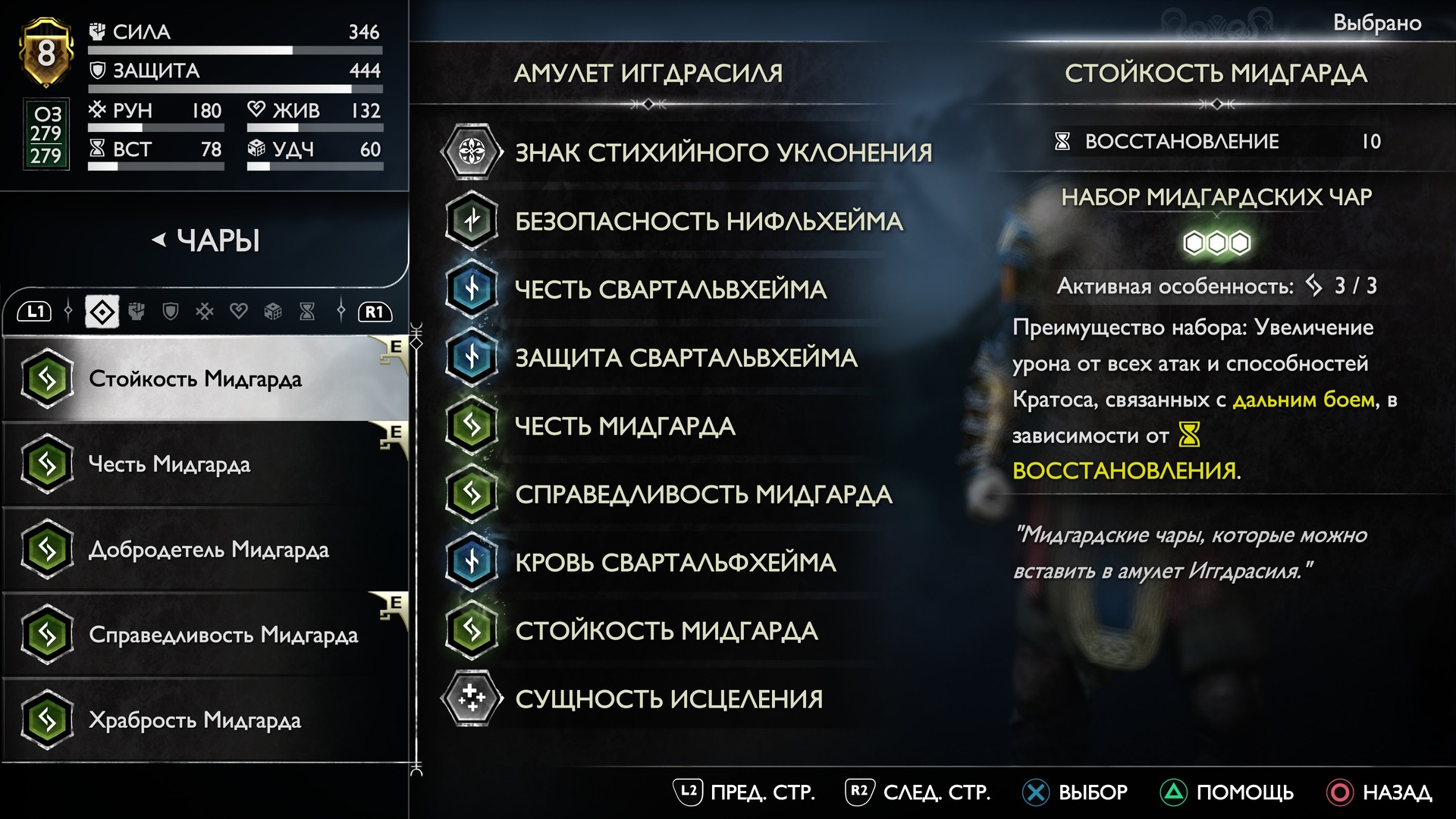 Ну, а теперь немного про геймплей. Сражения не получили особых изменений относительно игры 18 года. Добавилось копьё у Кратоса, два новых варината ульты. В роли компаньона теперь не только Атрей, и у каждого есть свои способности, некоторым можно учить навыки, как и Кратосу. Бестиарий все еще большой, встречаются противники с повышенным сопротивлением к определенному стихийному урону. Прокачка получила ряд обновлений. Да, нам все так же как и в первой части приходится получать опыт, чтобы открывать навыки для оружия, но теперь у них есть улучшения. Использовав навык определенное количество раз мы можем выбрать усиление урон, оглушение, стихию. Так же появилась реликвия, которая дает различные бонусы (атакующие или защитные) и имеет время перезарядки, как рунические атаки. А так же добавили амулет, содержащий 10 ячеек, который так же помогает выбрать усиления под свой стиль игры.