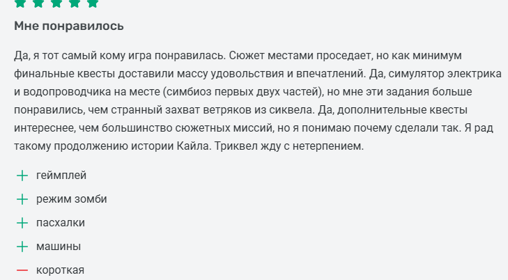 Да-да, я тот самый человек, у которого наиграно 200+ часов в первую часть и более сотни в сиквел. На сегодняшний день первая игра может быть простоватой с точки зрения сюжета и финального сражения (QTE я никак не ожидал). Но при этом история Кайла Крейна очень запала мне в душу. Я соглашусь, что вся игра по сути — курьер на побегушках с достаточно быстрым развитием взаимоотношений между персонажами (ни раз видел как люди придирались к тому, как так быстро Кайл стал лучшим другом Рахима и сильную привязанность к Джейд, для себя я принял тот факт, что Крейн был обязан жизнью перед Джейд и за счет этого произошло такое быстрое сближение с ними). Квестов подай-принеси действительно много, но NPC забавные (вспомнить того же Гази или братьев Толга и Фатина), задания порой смешные, а если брать во внимание наличие толп зомби и обилие точек для лута, то геймплей разнообразен. Да и Кайл — живой герой, который реагирует на события и не выполняет роль болванчика как в Far cry 5, где роль салаги максимально верно характеризует героя. Так же было интересно пройти the following — дополнение, которое дало еще несколько десятков часов побыть в истории Кайла, а в конце пустить скупую мужскую слезу (помню как я проходил финал очень поздно ночью, получил грустную концовку и пошел смотреть на альтернативную и понял, что негрустного финала не существует).