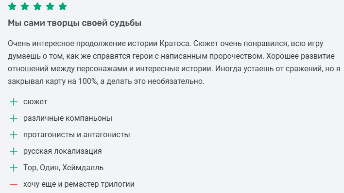 Игра 5.0/5.0. Вот одна из тех игр, которую хочется заново пройти с теми же эмоциями, как при первом прохождении. Видел достаточно негативных мнений, относительно затянутости или нудности. Как я уже писал только один момент мне был скучен, когда на разных животных гуляешь по миру великанов (очень медленно животное ходит) и всё. Геймплей за Атрея, возможно, не сильно интересен, но для сюжета важен.