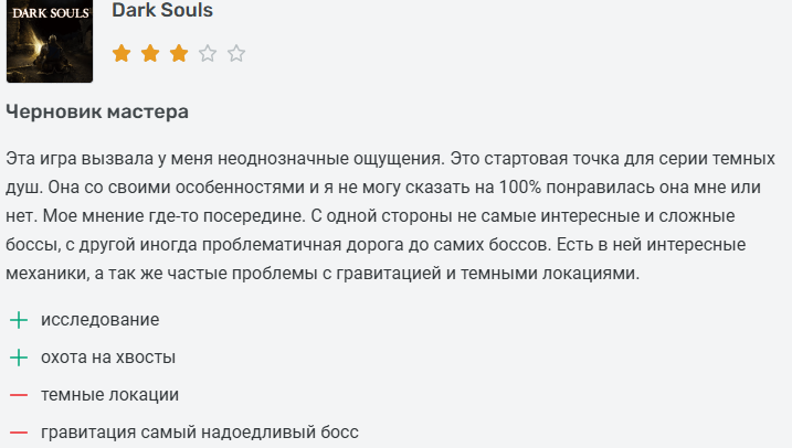 Моя оценка 6/10. Пытаясь посмотреть на игру непредвзято (если бы не было опыта других игр студии) складывается ощущение, что в 2025 не стоит начинать знакомство с играми фромов с первой части. Само собой есть интересные механики, боссы, хорошо построенные локации. Но глобально игра не так интересна с геймплейной стороны. Сугубо моё мнение, не настаиваю что оно единственное верное. Уверен, что многие безумно любят первую часть, а я рад что начал не с нее. По причине того, что я мог просто бросить ее и не стать фанатом этой студии.