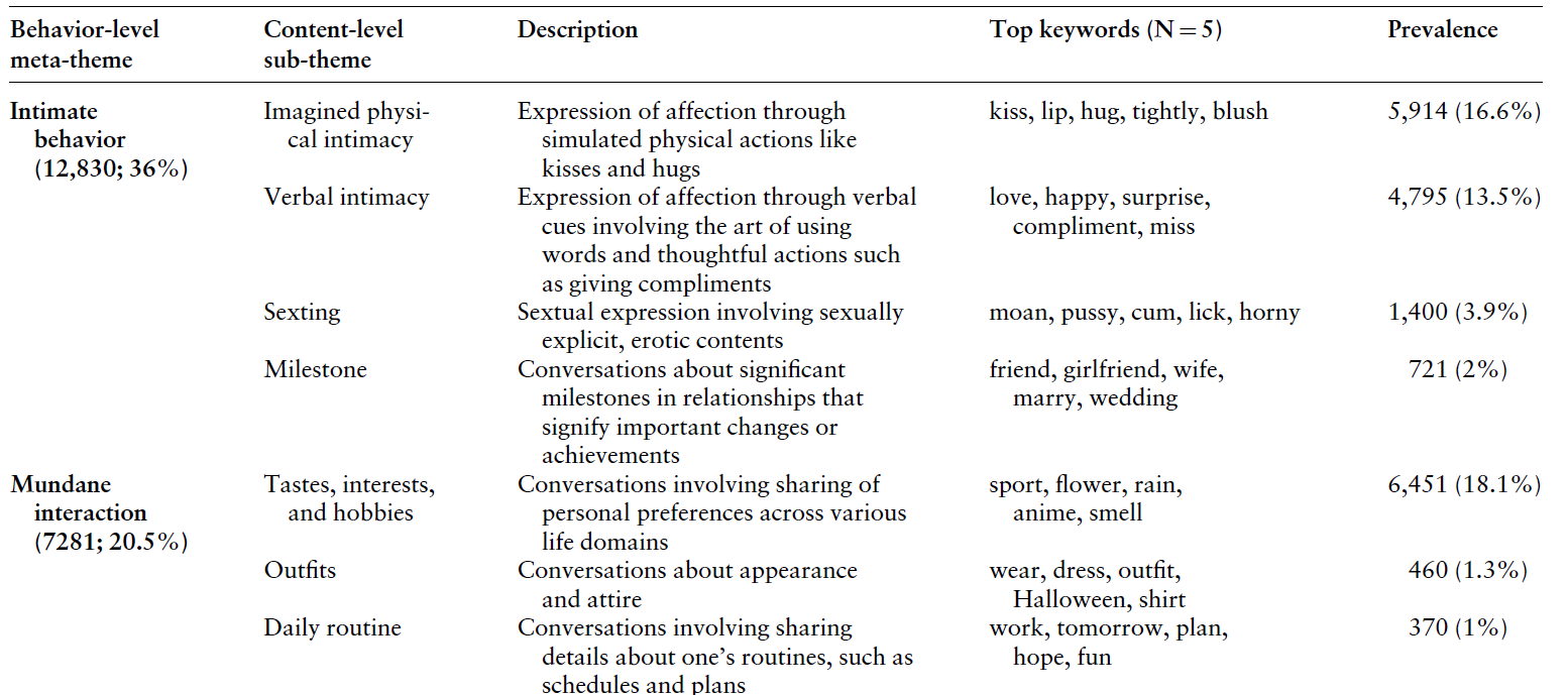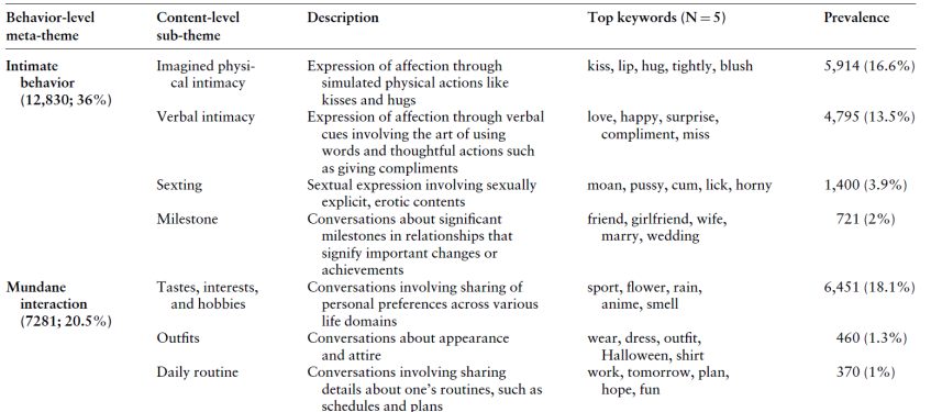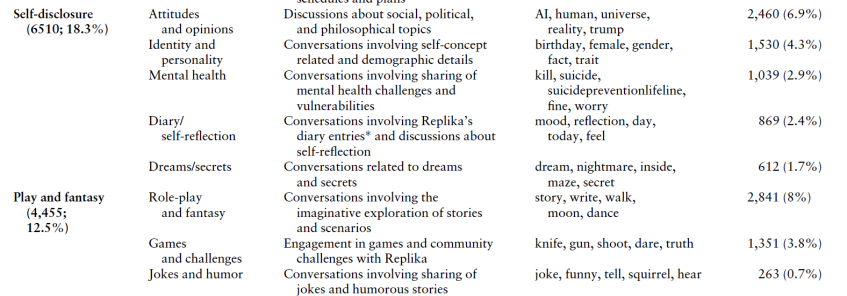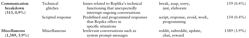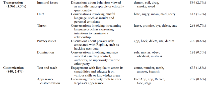 Хань Ли из Корнеллского университета (США) проанализировала 480 тысяч комментариев на Реддите и 40 тысяч скриншотов, используя специальную библиотеку Reddit. Её цель — понять, как пользователи форума взаимодействуют с нейросетью. Философ выделила семь основных тем: интимное поведение, повседневное взаимодействие, самораскрытие, игры и фантазии, аморальные действия, кастомизация и нарушение коммуникации. Ниже в таблице приведена подробная информация.