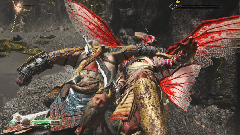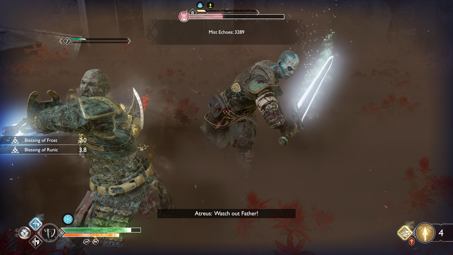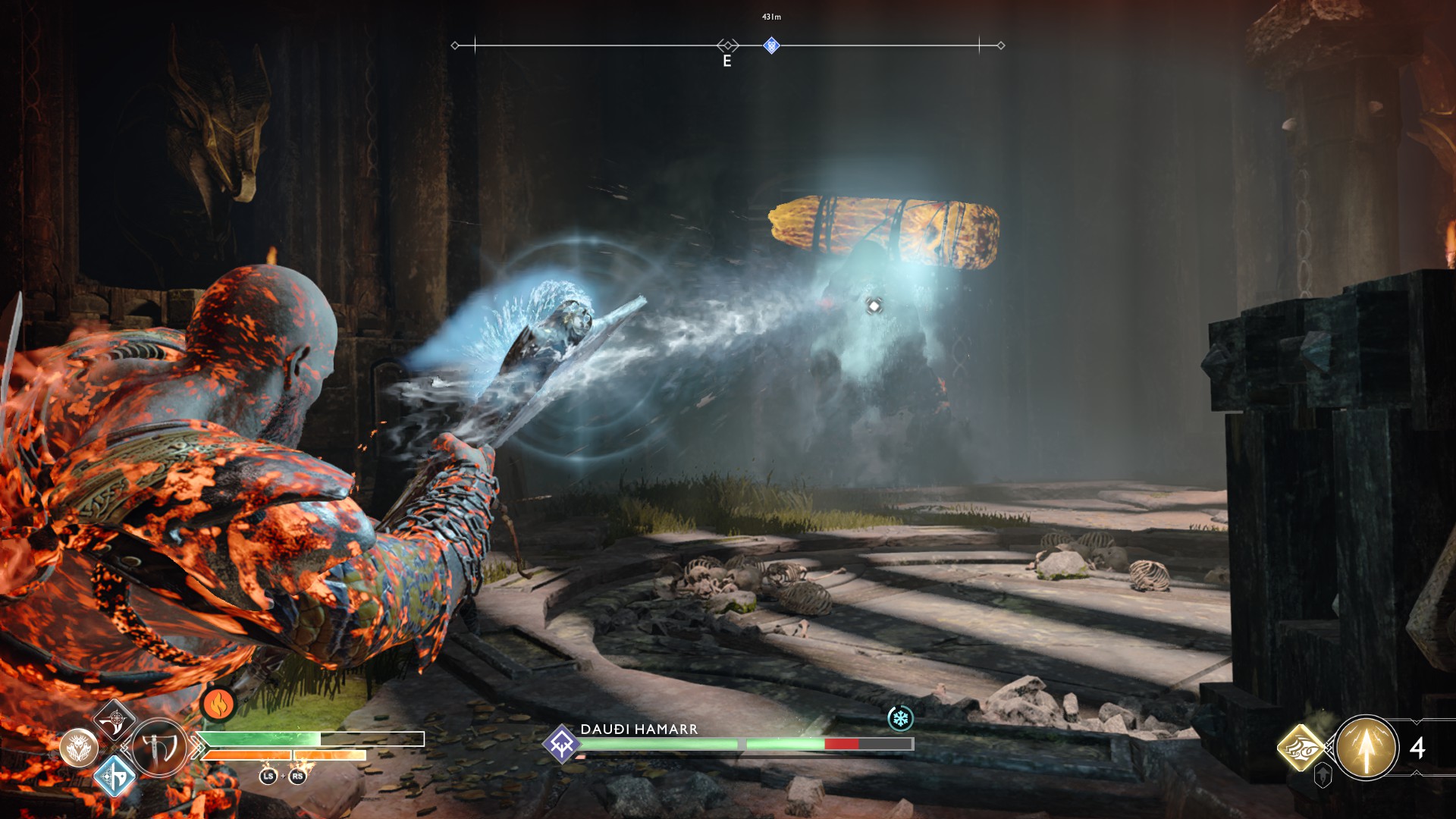 Мальчик тоже оружие. Для Атрея отведена кнопка, по команде которой он стреляет во врага под отцовским прицелом. Урон низкий, зато шкала оглушения хорошо пополняется и не опустошается между комбо Кратоса. По мере роста сына увеличивается его урон и открываются новые виды стрел. В каком-то роде они функционируют как элемент метроидвании, который открывает ранее недоступные проходы и сундуки. Разом в колчане имеется три стрелы, они восполняются за несколько секунд. Так что есть смысл спамить кнопку при любой возможности, особенно на позднем этапе игры