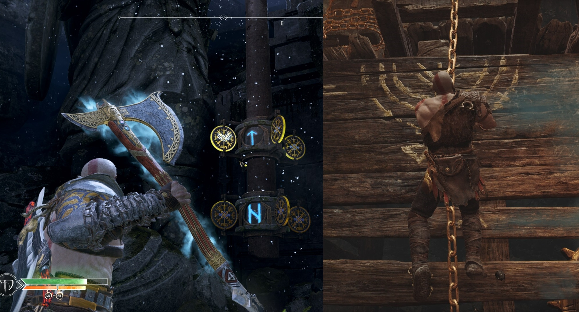 Лазание по стенам не поддакивание традициям кинца, а наследие франшизы. Греческие крепости наполовину состояли из простых платформенных сегментов, которые перекочевали в Скандинавию в упрощенном состоянии. Больше нельзя прыгнуть не туда и невовремя, легкий челлендж совсем пропал. Чисто время для прослушивания диалогов. Все-таки поддакивание кинцу… Кстати, прыжки в бою тоже были удалены. Кратос пригвожден к земле как камень. Впрочем, незачем прыгать против обычных гуманоидов. Нордический мир приземленный целиком и полностью, вот и Кратос от земли отрывается только по скриптам