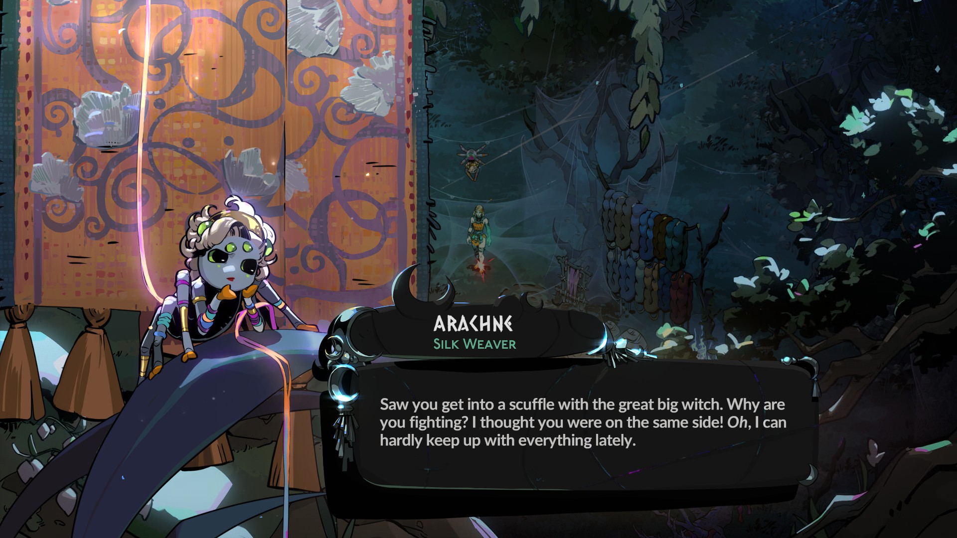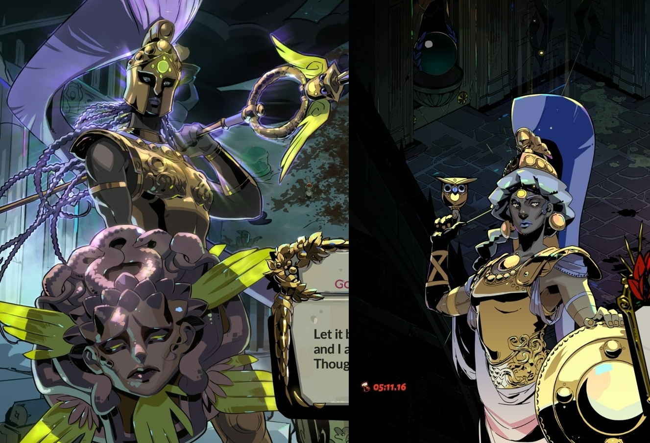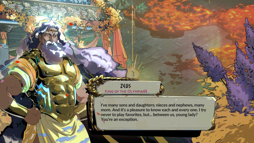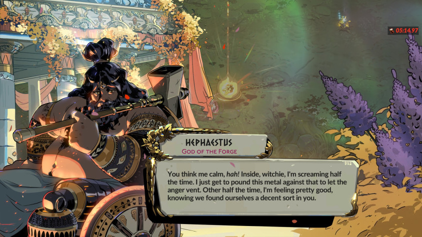 Разговоры с персонажами получили более насыщенный визуал. Теперь за говорящим стоит задний фон, соответствующий его локации. Олимпийцы доносят послания из своего золотого сада, перед ними летит упавшие лепестки. Каждый биом красочен по-своему, некоторые особые комнаты получили собственный фон. Также персонажи получили мимику. Олимпийцы всегда держат божескую улыбку, но при обиде активно хмурятся. Особенно сильно от мимики выигрывает Мелиноя. У нее не только несколько поз, но и куча выражений для них. Серьезная сестра выражает больше эмоций, чем весельчак Загрей и его два спрайта, за счет чего кажется живее и многограннее. Арт Supergiant Games, как всегда, на высоте. Одно загляденье!