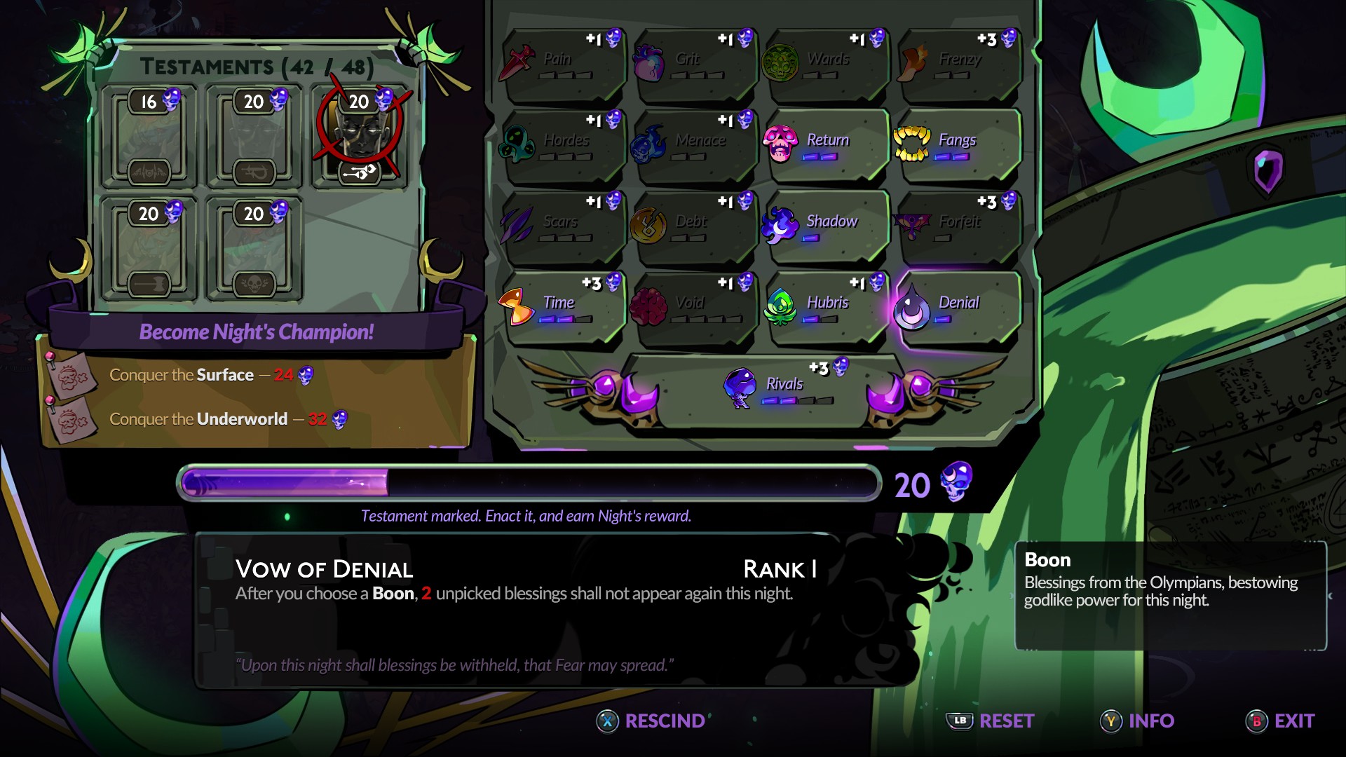 Раз игрок набирает мощь, надо выстраивать ему преграды. Такова роль Обета Незримых, алтаря с усложняющими забег клятвами. Он представлен таблицей, и вы активируете трудности согласно своим предпочтениям. Есть как банальные «враги наносят больше урона», «враги имеют больше здоровья», так и интригующее «соберите призрак врага после его смерти, а не то он возродится». Чуть больше половины клятв влияют сугубо на цифры, но это не означает сухую сложность. «Пониженное лечение» все ещё звучит банально, но оно в первую очередь изменяет поведение игрока. Игра прощает меньше ошибок, так что надо их меньше совершать. Отдельно надо похвалить «клятву соперников», которое превращает босса в более злостную версию себя. Нутро остается тем же, но поведение кардинально меняется. Схватки становятся более насыщенными и динамичными под стать выросшим опыту и сноровке. Хотя провалить забег будет вдвое проще, чем с другой клятвой