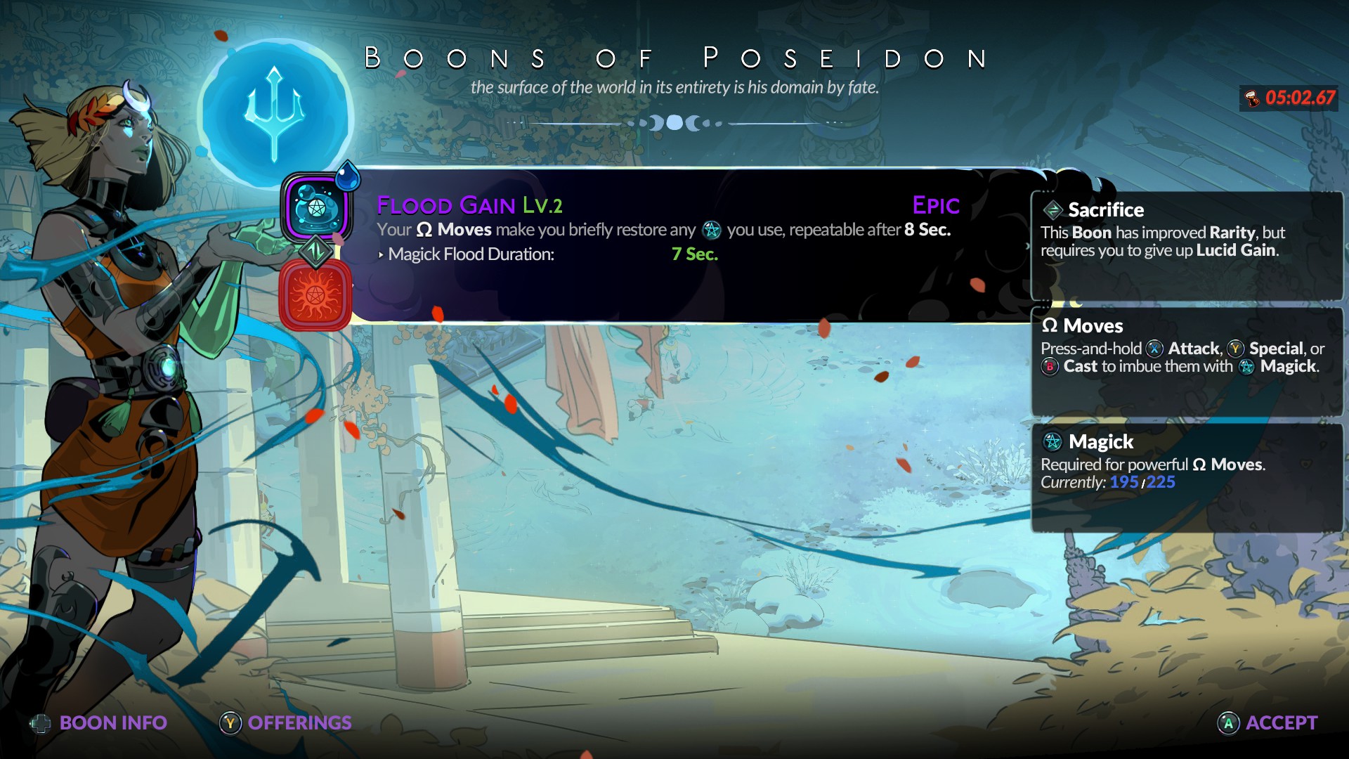 Один дар может вступить в синергию с другим, но только если это задумано его дизайном. У богов есть основные дары, приносящие главные плоды, и вспомогательные для них. Например, основной дар Посейдона только добавляет урон атаке, а вместе со «скользким уклоном» атака также нанесет дебафф на врага. Простенько, но очень полезно. Hades 2 старается сделать как можно больше такого дизайна и преуспевает в этом. В ней гораздо больше слоёв сочетания, чем было в Hades 1. Дары на омега-атаку получают повышенный урон за счет дара на основную. Зачастую они увеличивают потребление маны, что быстрее заряжает сумеречное заклятие и повышает общий урон Мелинои. В зависимости от дара ведьмин круг работает инструментом как контроля, так и смерти