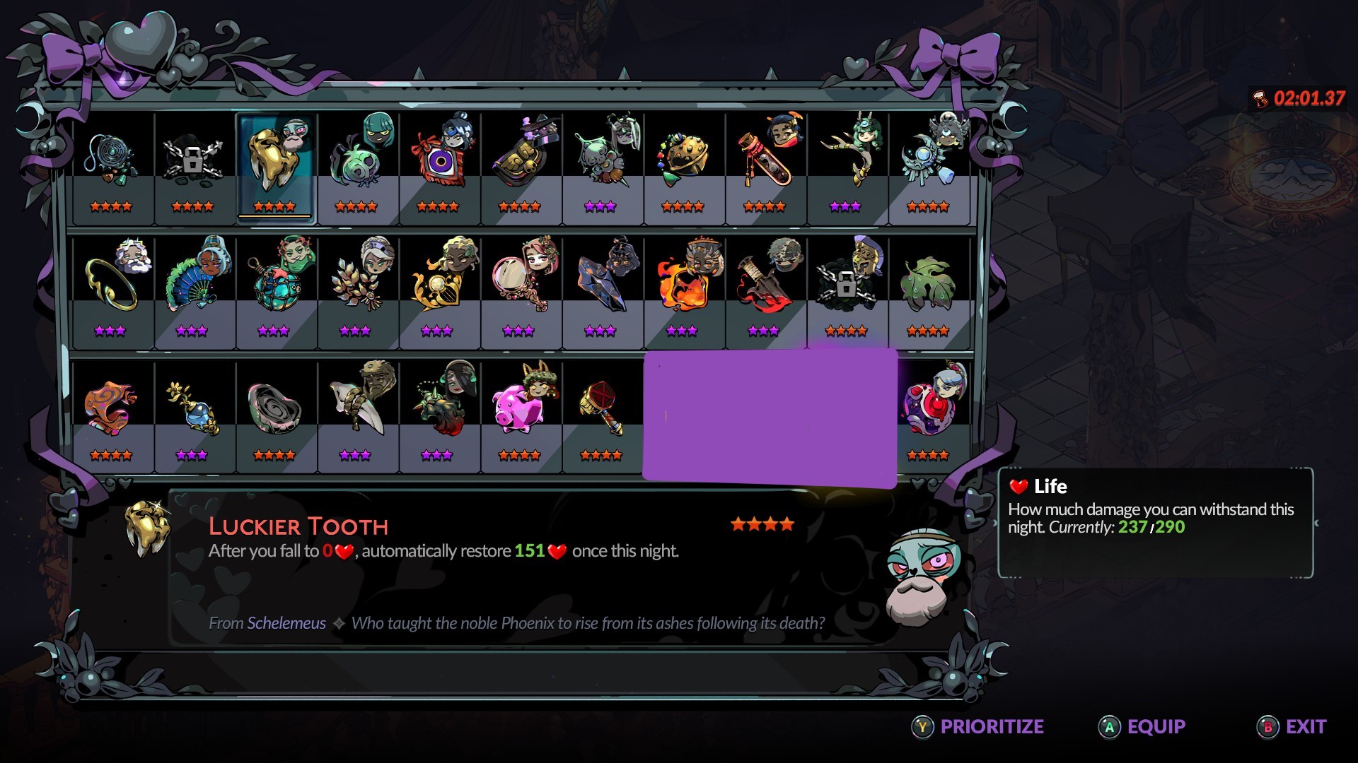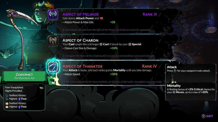 Обет Незримых сохраняет новизну из забега в забег. Постепенно узнаешь, как можно переиначить игру, осознаешь свои пределы и учишься играть лучше. Это одна из лучших механик обеих Hades по моему мнению. В то же время ничто не мешает игнорировать ее. Награда за активацию клятв тратится только на улучшение оружия – для большей мощи надо повысить сложность. Играйте только ради сюжета, если не хотите заморачиваться