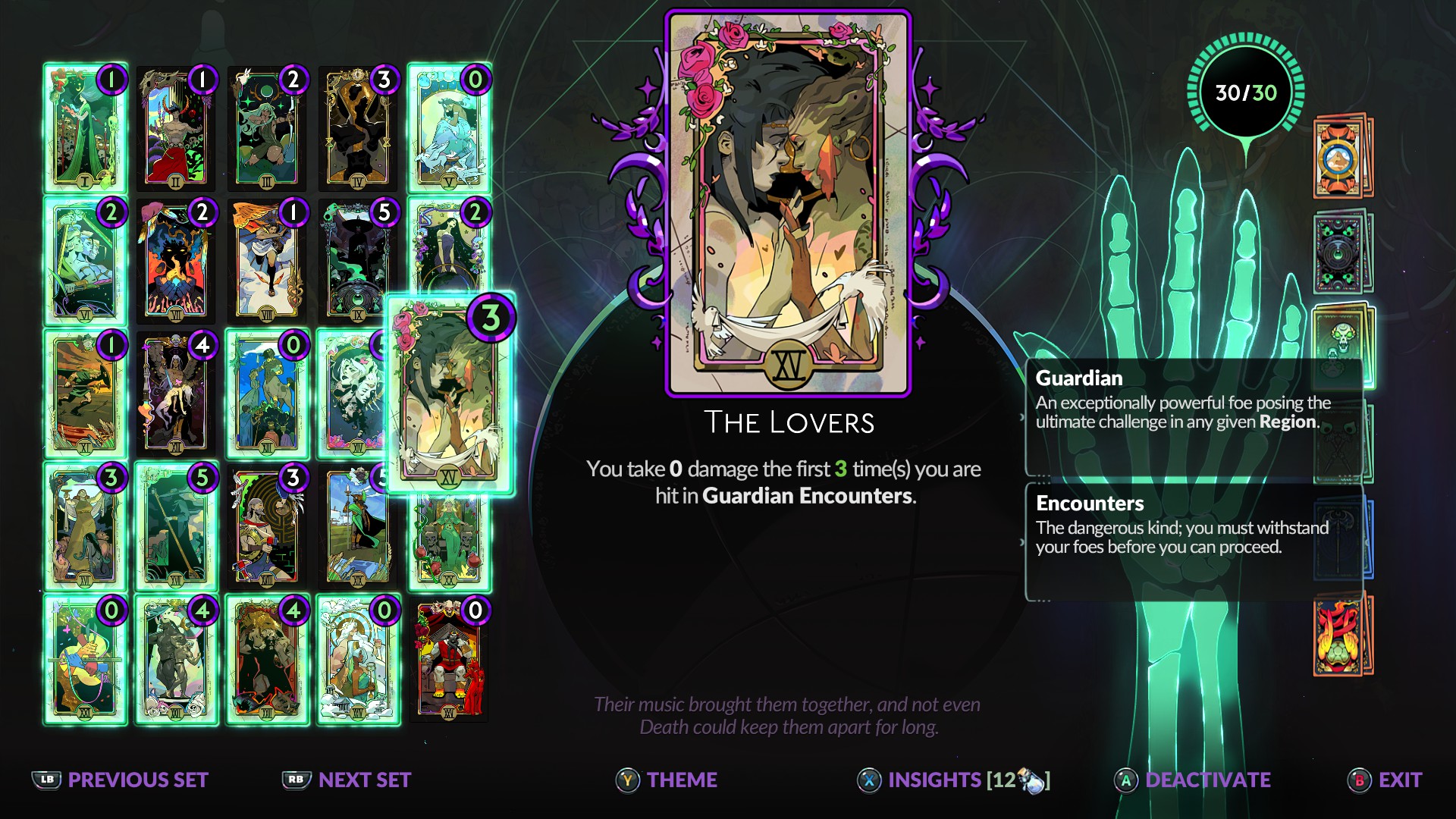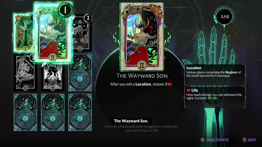 В Hades 1 вместо колоды арканы действовало работало Зеркало Ночи. Оно представляет собой последовательный список, а не обширный перечень. Изначально есть только «фиолетовый» вариант, а через надцать часов появляется "зеленый". Игрок волен заменить улучшения из одного на другой, вот только выбор между ними часто однобокий. В одних случаях зеленые пункты слишком слабы – в других фиолетовые слишком сильны. Hades 2 гораздо интереснее исполнила мощь героини. Из забега в забег можно и нужно менять колоды по хотению и для веселья. Самые дорогие и сильные карты выстраивают основание, а дешевые служат комфортом. Иногда стоит заменить одну дорогую на тройку дешевых или наоборот. Все зависит от личных предпочтений