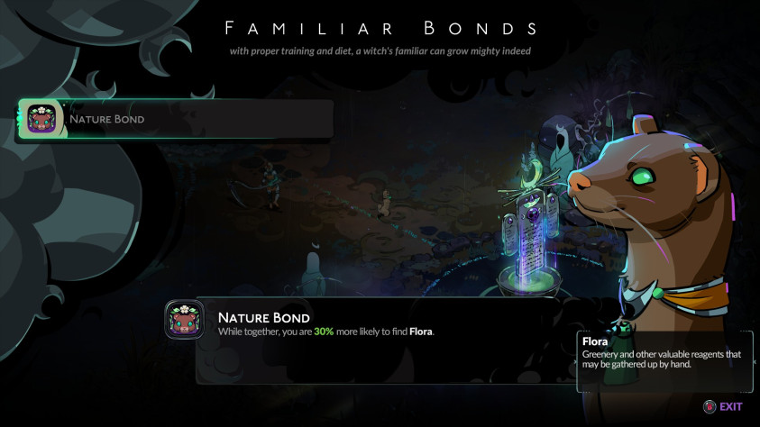 Собирать ресурсы помогают ведьминские фамильяры. Питомцы Мелинои очаровано анимированы и нарисованы. Изначально вы будете их брать ради повышенного шанса встретить конкретный тип ресурса, а затем ради их уникального баффа. Ворона Раки дает небольшой шанс крита абсолютно всем атакам – каждый раз трехзначный урон растянет рот в улыбку. Хорек Гале следует по пятам Мелинои и готов защитить ее от трех ударов за этаж. Кошка Тула пролежит всю битву калачиком, если вы не будете подначивать ее на зверское истребление врагов. Все зверьки полезны, выбор зависит прежде всего от предпочтения