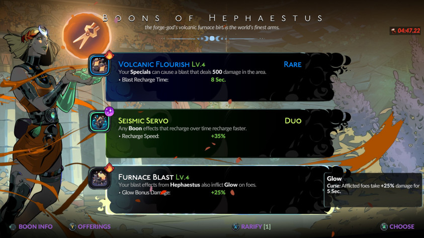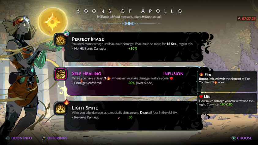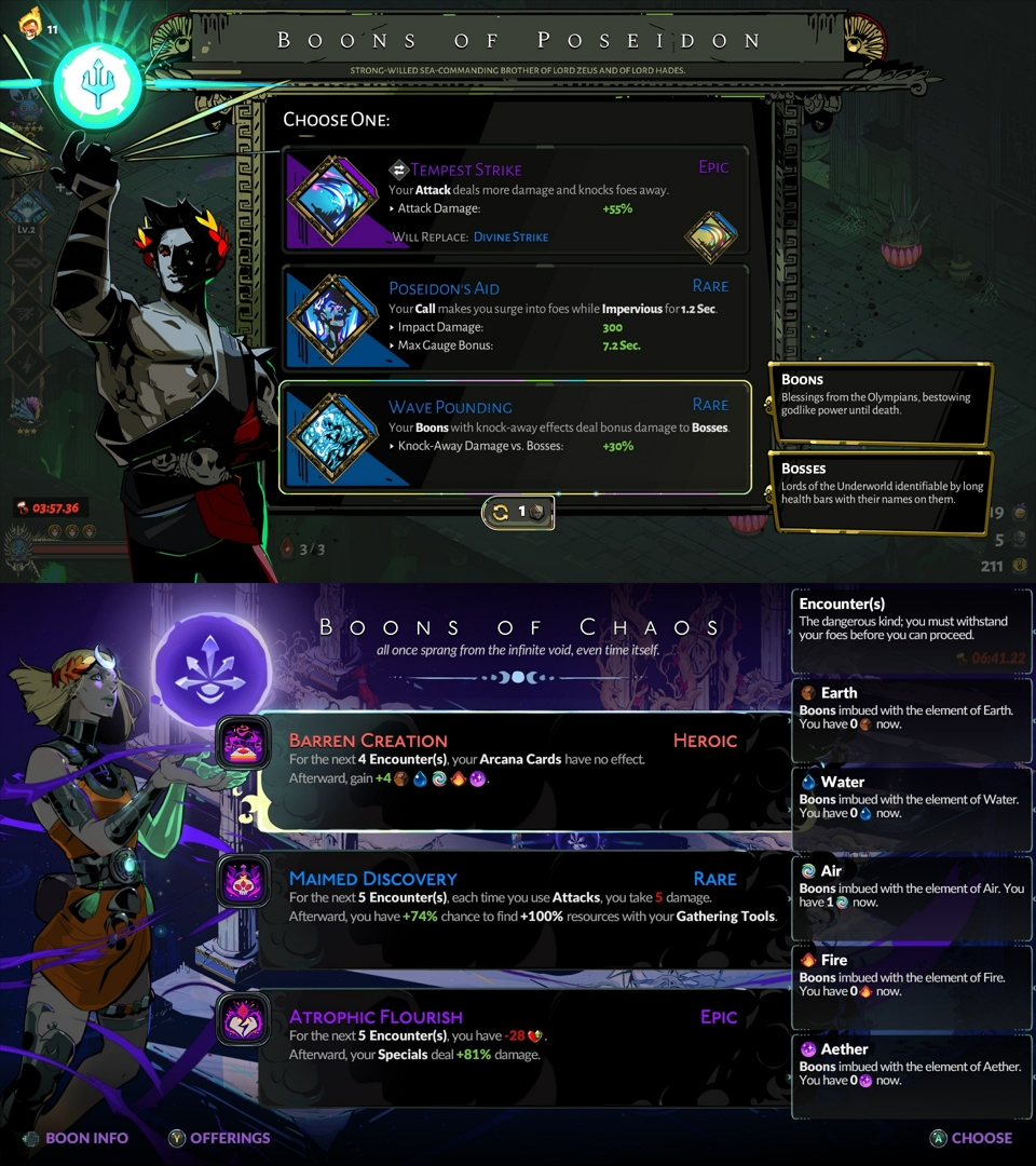 Главный источник мощи – дары богов. Зевс, Аполлон и остальные более чем рады помочь дитю Аида, какие бы низкие не были шансы на успех. При подборе дара открывается экран с выбором из трех возможных усилений. В зависимости от синергии с выбранным оружием или собственного желания игрок подбирает именно то, что ему нужно. Каждый бог имеет собственную специальность и особенность. Богиня любви Афродита повышает урон в ближнем бою, одурманивает врагов на битву между собой и понижает их урон игроку. Она слишком полезна на кинжалах из-за их низкого урона, но ее дар можно поставить на рывок или каст. Со временем начинаешь игнорировать одних олимпийцев в конкретных случаях и выискивать других