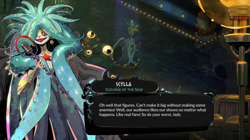 Культурное достояние Hades 2 – музыкальная группа Сцилла и сирены. Из ночи в ночь они зазывают моряков своими песнями, набирают аудиторию и топят ее. Так случилось, что их сцена стоит прямо над выходом из Океана, и Мелиное приходится прорываться сквозь выступление. Под рок-н-ролл всегда приятно сражаться, а биться с рок-концертом в разы веселее. Битва с ними настолько крутая, что я не хочу ничего лишнего про нее говорить. Вам стоит заценить ее самим