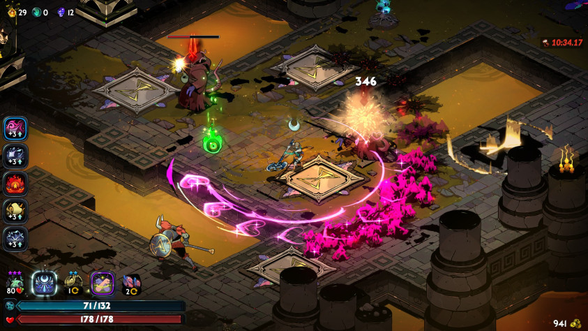Hades – рогалик. Для массы игроков это означает прохождение одних и тех же стычек с одними и теми же врагами, а провал означает трату времени. Как бы ни так. Традиционный rogue-like здесь переработан в rogue-lite, то есть упрощенный рогалик. В оригинальном жанре из одного забега в другой ничего не переносятся, меняется только опыт и сноровка игрока. Единственное развитие – больший репертуар возможного случайного лута. Поджанр-наследник позволяет прокачивать главного героя, накапливать ресурсы для того или иного развития между забегами. Hades в дополнение дает игроку контроль над случайностью и позволяет выжать из нее всю возможную выгоду