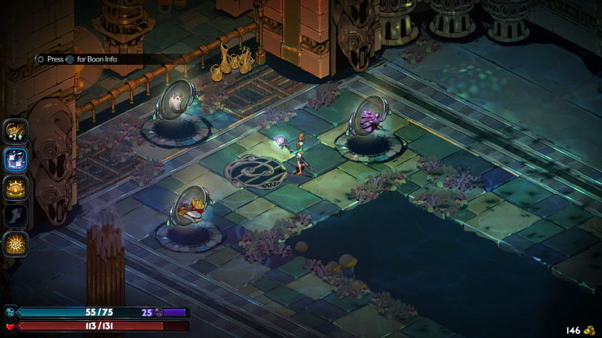 Традиционная раскладка этажа такова: череда случайных комнат, выход из одной ведет в другую. Однако почти всегда открывается два-три выхода с показанной наградой, и игроку нужно выбрать подходящий вариант. Hades наделяет игрока властью выбора: вам нужно здоровье или боевая мощь, тот ресурс или этот? Хватает ли денег на посещение магазина, или обойти его ради ограниченной халявы? В рогаликах игрок, как правило, ограничен тем, что ему дано. Здесь же дается возможность склонить судьбу в свою сторону