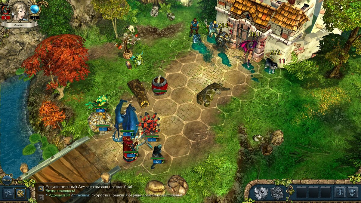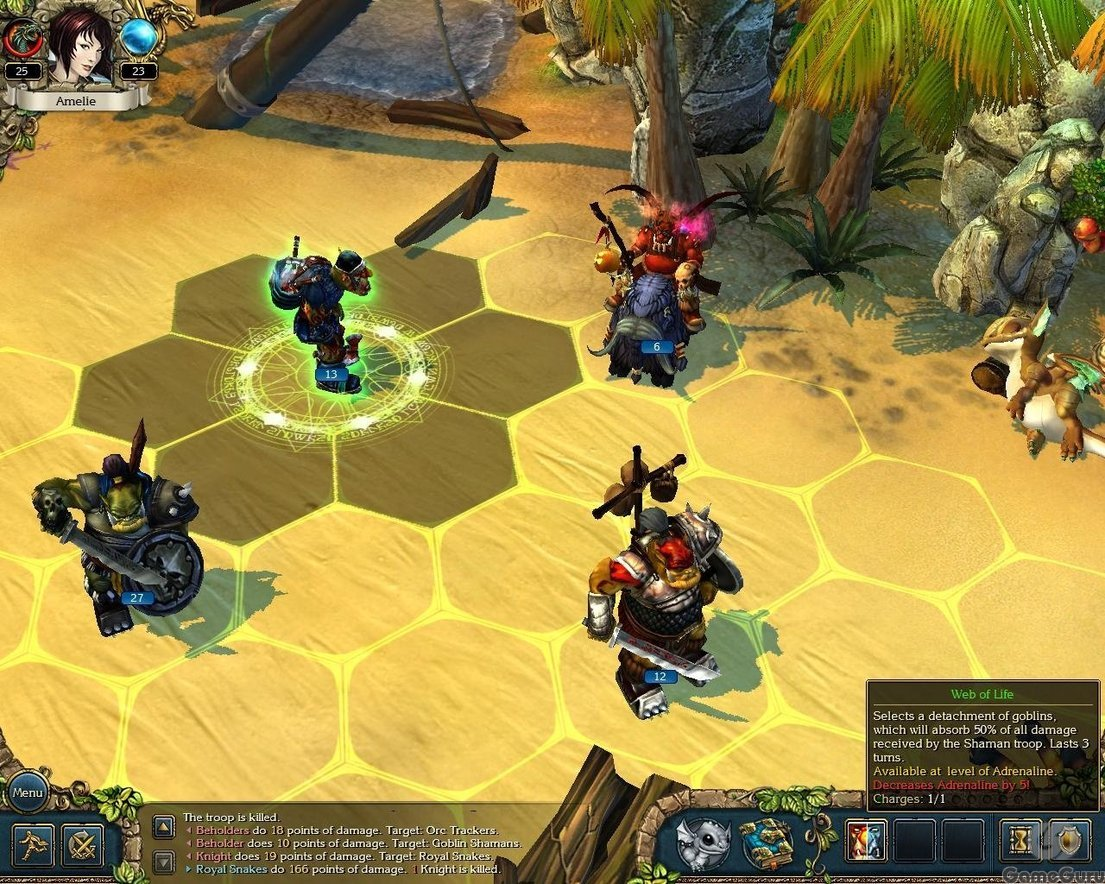 Суть адреналина в следующем: орочьи войска накапливают в бою адреналин, который открывает доступ к специальным умениям и усиливает бойцов. Адреналин можно повышать не только в бою, но и с помощью умений героя, талантов существ, артефактов и заклинаний. Звучит просто, логично и даже знакомо. Привет, Heroes of Might and Magic V: Tribes of the East! Усиления порой настолько сильные, что превращают гоблинов-шаманов в настоящую машину смерти, а также сильно усиливают многих других юнитов. Сильные заклинания, улучшения характеристик, возможность атаковать 2-3 раза за ход — всё это кардинально меняет ход игры. Механика интересная, но не доведённая до ума и не сбалансированная.