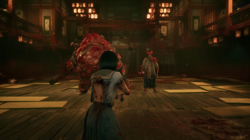 В следующей комнате Симидзу Хинако находит своих трёх друзей, подвешенных на мясные крюки, их тела высушены досуха от крови. Следующие двери отворяются перед ней и радостные возгласы невидимых гостей приветствуют её возвращение. Она становится свидетельницей роскошного пира, где вместо блюд на столе гниющее мясо и овощи, на которые слетаются мерзкие насекомые. Во главе стола сидит её пьяный отец и радостная мать, когда отца просят показать "мастера клинка". Он берёт здоровый нож для тунца и заносит его над головой, напоминая о том, как однажды также замахнулся над девочкой-подростком, а его тело разбухает и искажается, пока не остаётся лишь огромный кусок живого мяса, живот которого рассекает огромный рот. А к его "руке" прирос огромный кусок железа, которым он старается разрубить Симидзу Хинако надвое. Его жена, такое же чудовище, но в виде слепой, исчерченной следами побоев и надругательств женщины, помогает своему мужу искромсать свою дочь заточенным ножом. Замечательная, сложная битва с боссом!