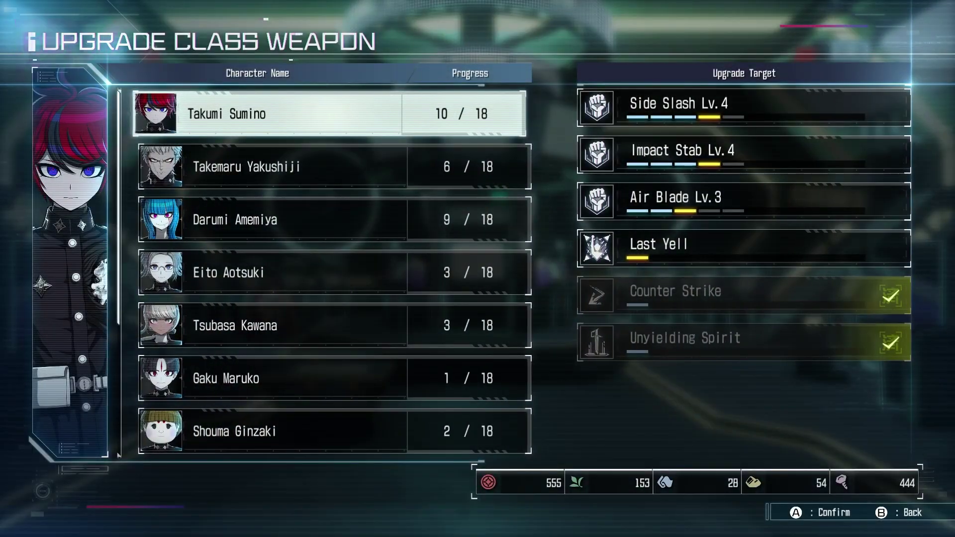 Между битвами и сюжетными событиями у тебя есть фритайм практически один в один как в Данганронпе. Ты выбираешь с каким персонажем поговорить, либо же подарить подарок и постепенно за счет этого качаешь характеристики Такуми. Прокачка эффективности мувов каждого перса требует соответствия уровням дисциплин и определенные ресурсы