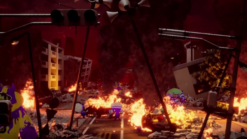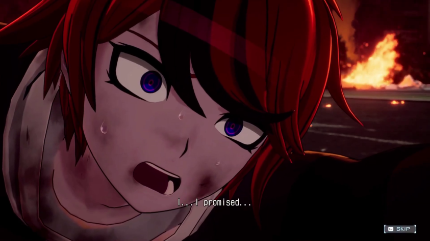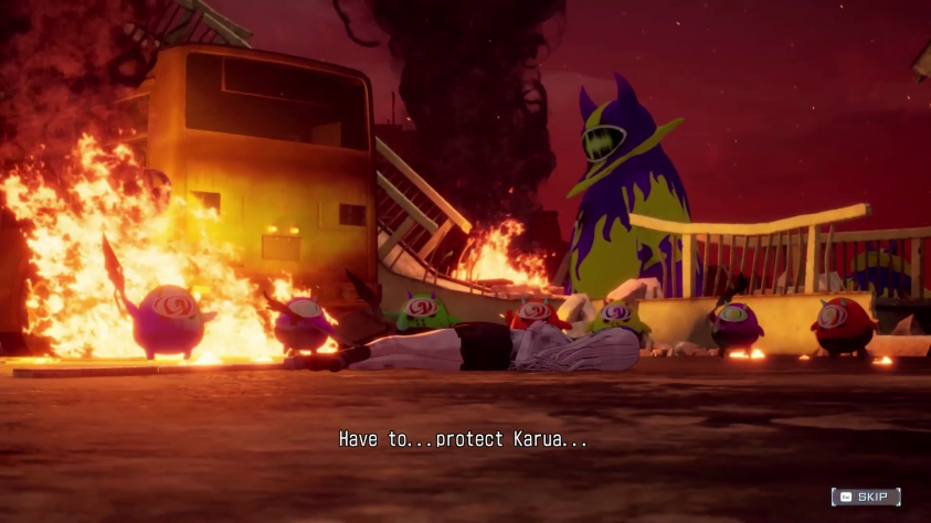 Такуми, понятное дело, оDLCвает, убегает, тут же пересекается с Каруа. В этот момент пришельцы буквально начинают вторжение: нелепо выглядящие монстры разносят комплекс, крошат людей, все в огне. Парочка пытается убежать, но внезапно рушится мост.