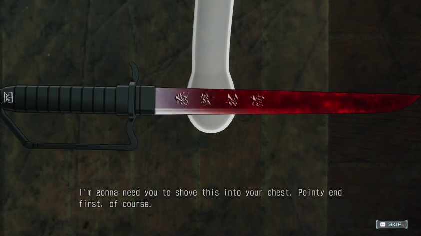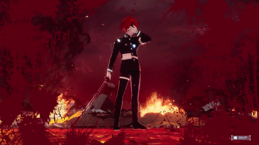 Такуми вонзает клинок в грудь и потоки крови образуют вокруг него кокон, в котором он трансформируется в боевой черный костюм.