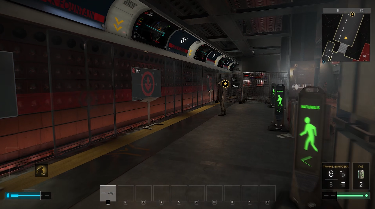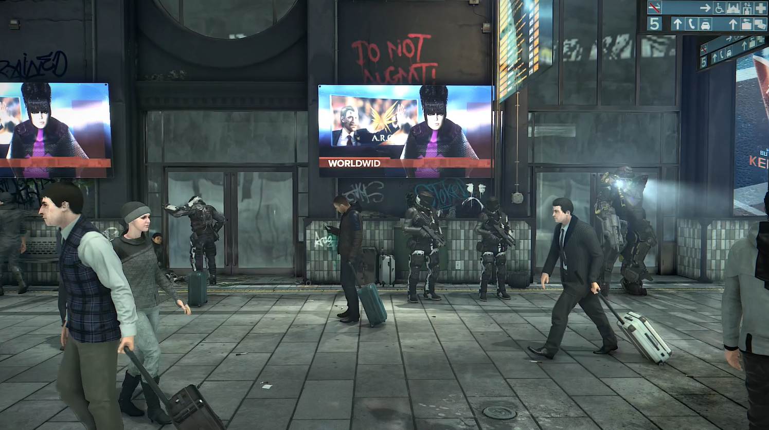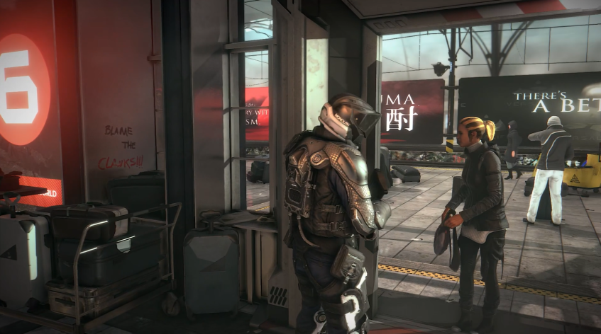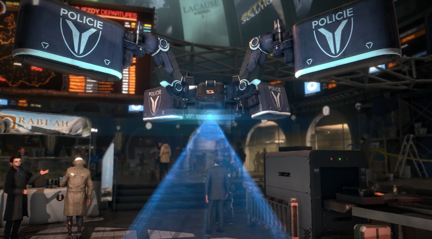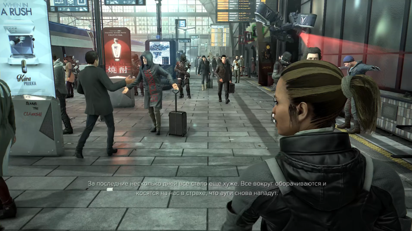 Нам довольно быстро дают понять, что аугов тут не любят, что полицейские лютуют, и что, в целом, это действительно вокзал: вот просторная платформа вот рамки, вот расписание.