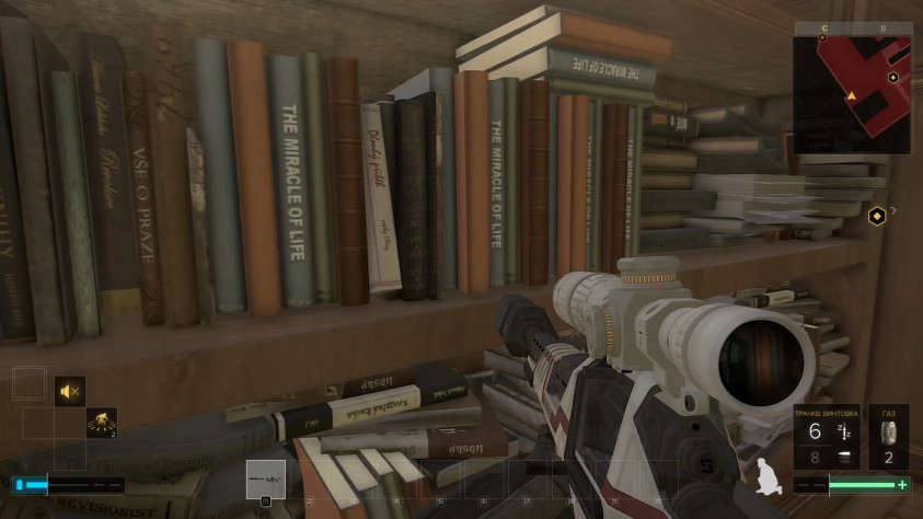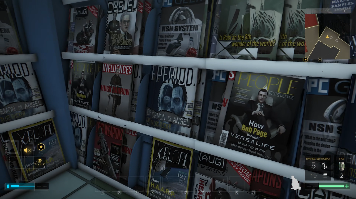 Нам предстоит вернуть свои аугментации, а значит мы попадем в большой книжный магазин, где тоже так или иначе мы обратим внимание на количество деталей. Буквально всё пространство в магазине завалено книгами, и у многих из них есть обложки и корешки.