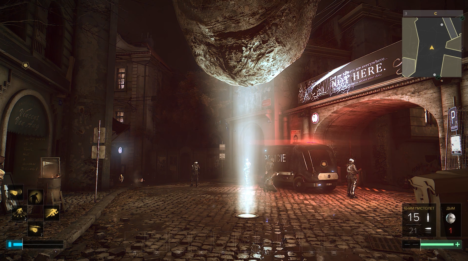В остальном, все магазины закрыты, повсюду полицейские кордоны, полицейские машины, броневики, полицейские ленты, дождь, несправедливость. Зато аутентично, вот вам тот самый жанр киберпанк.