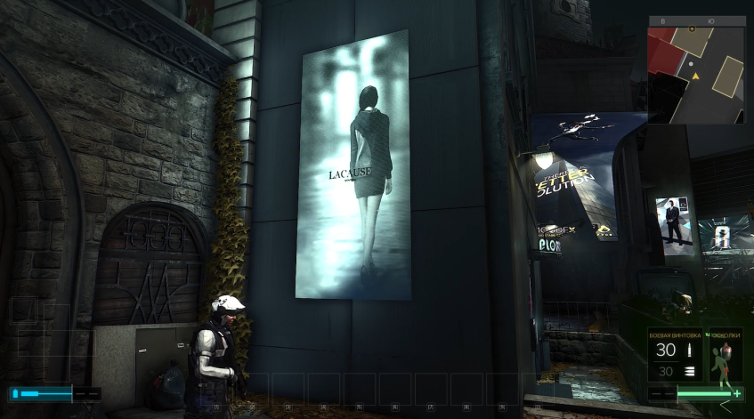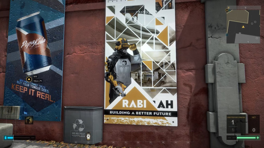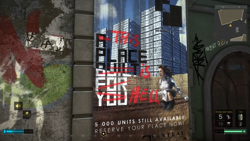 Граффити на стенах, плакаты, объявления и реклама, причем некоторые из них ободранные, как и полагается настенной рекламе в таких городах, то есть кто-то из дизайнеров отметил себе, что рекламу явно будут пытаться содрать со стен.