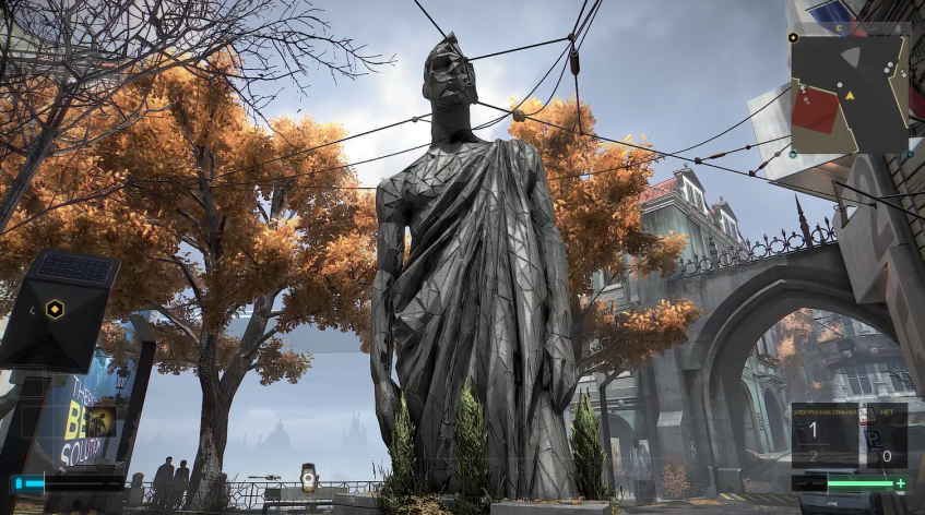Эти строгие треугольные формы будут наблюдаться буквально повсюду: в заставке игры, в аугментациях главного героя, в одежде персонажей, и, конечно же, в архитектуре.