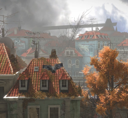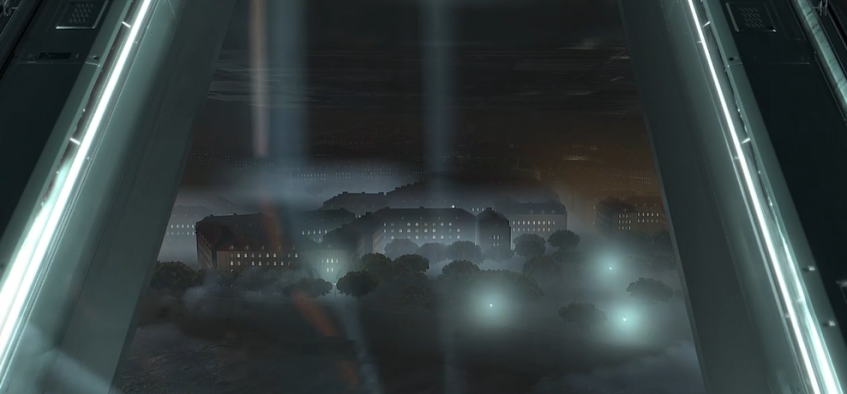 Что же мы видим? Да на самом деле, не так уж и много: всего лишь пасмурная погода, загадочная конструкция, нависающая над городом, несколько домов и хоп, ставим на паузу. Эти дома надо обсудить.