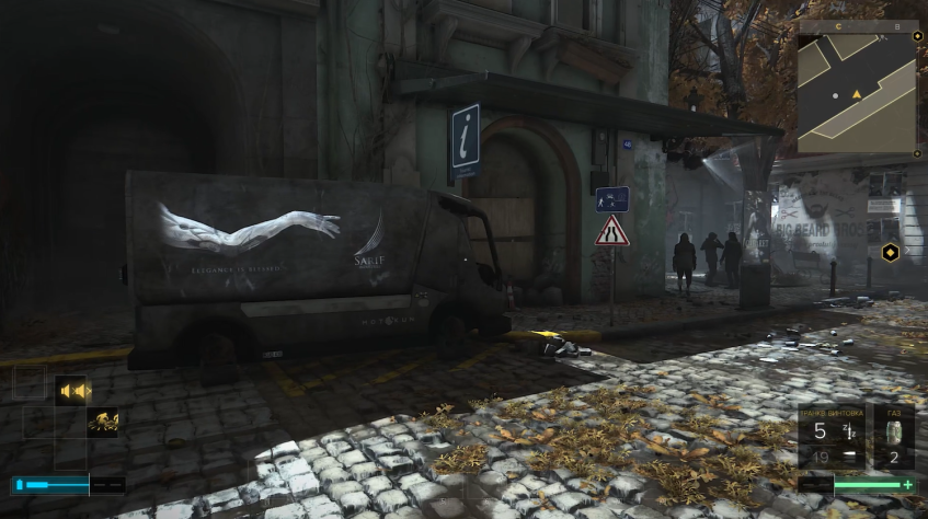 Первое же, что мы увидим, когда выйдем на улицу - это сломанный грузовичок с символом Шариф Индастриз, на фоне потрепанных и порушенных домов, как бы намекающий нам, что золотая эпоха человечества прошла, и от нее остались лишь разруха и запустение.