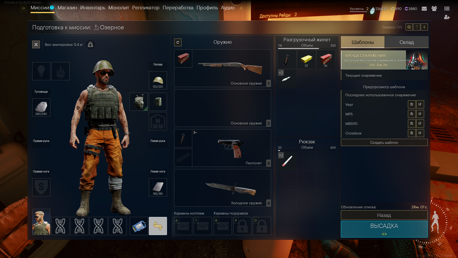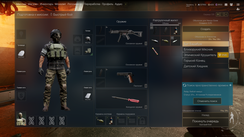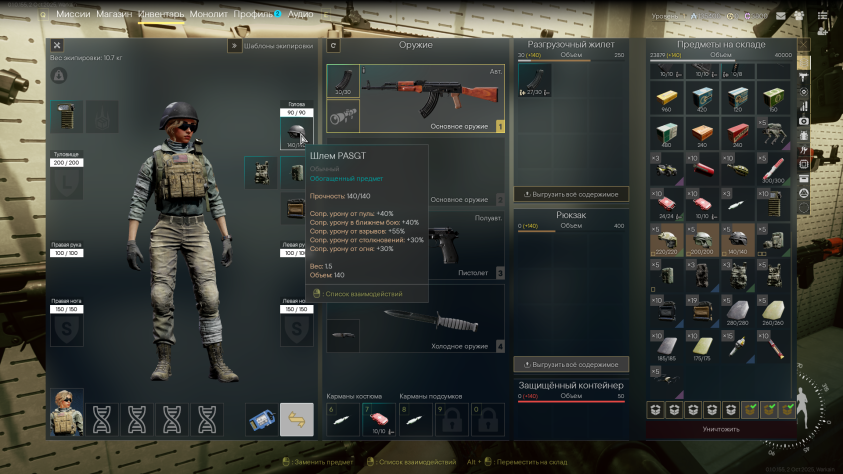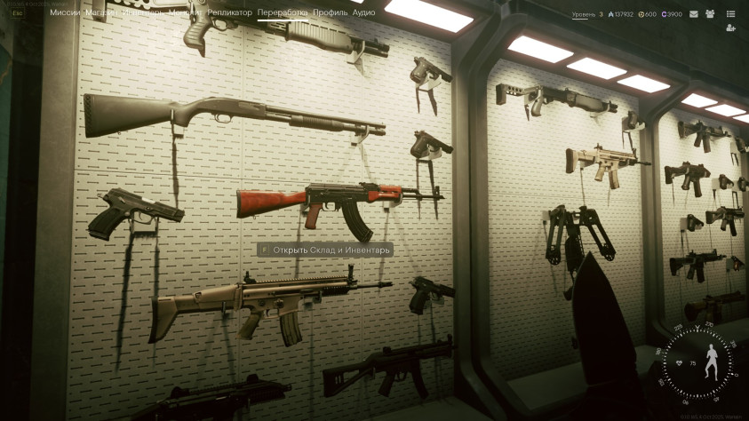 Становится доступен склад. Тут наши вещички, из которых можем подбирать снарягу для забегов.