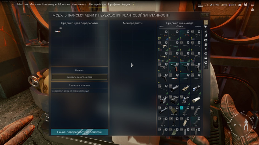 Оживает станция по переработке предметов. Тут есть небольшая хитрость. Все предметы могут быть с разными статусами. И вот, в соответствии с этими статусами получаем в итоге ту или иную валюту при разборе.