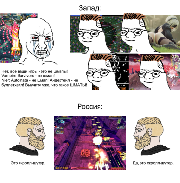 Я сам шмапер и пользуюсь термином «шутемап/шмап», но наверно, было бы лучше считать «шутемап» зонтичным термином, также включающий в себя и ран-н-ганы, и шутеры с видом сверху, и какие-нибудь другие стили. Существует более описательный термин. Вот мем моего приготовления. (Впрочем, термин «скролл-шутер», как я понимаю, исконно русский, самым близким аналогом в английском будет «scrolling shooter», но это не то чтобы хорошо звучит как название жанра и не так часто применяется.)