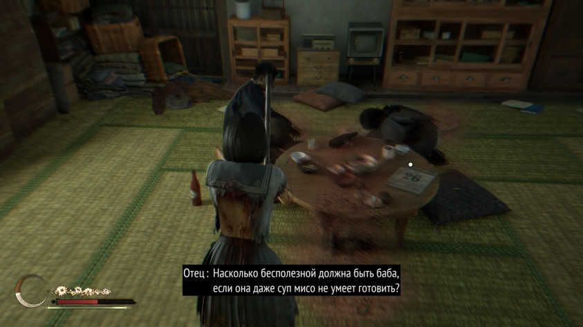 Когда я писал, что мать «не чувствует себя беспомощной», я, пожалуй, не был очень точен, не приведя контекст — речь не о том, что она втайне от дочери матриархат устраивает, а штуки типа «Один раз мы очень сильно поссорились, так я с ним не разговаривала всю неделю и ещё половую тряпку в суп выжимала. Так он ко мне приполз на коленях и попросил прощения». Буквально учит Хинако «женским хитростям», как влиять на мужа — с одной стороны, это правда и даёт ей некоторое влияние в семье, а с другой, как по мне, в этом всё равно читается немного самообмана, т.к. она всё равно подконтрольна мужу с точки зрения всех институтов. Это многогранная динамика традиционной патриархальной семьи, где все немного играют уготованную им роль. Мне нравится, что игра относится к этой теме достаточно тонко (например, то, что в битве с боссом отцом и матерью, достаточно убить только отца, чтобы победить, а тот ещё и может свою жену задеть атаками).