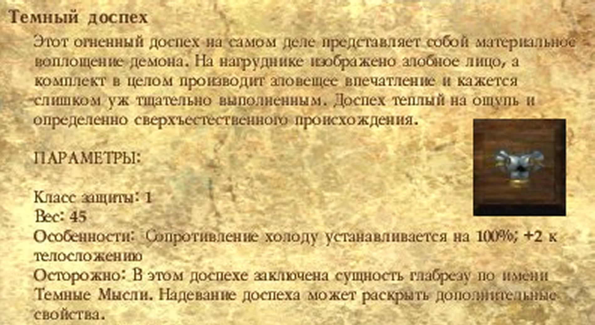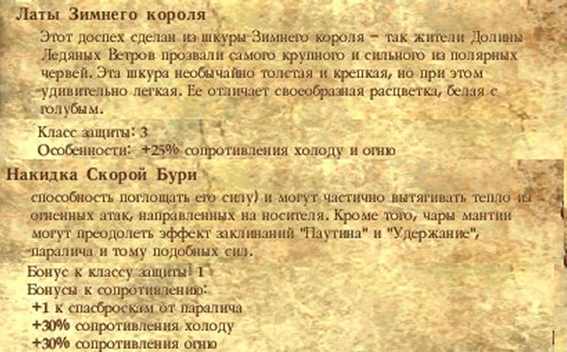 Отыскался весьма неплохой доспех - «Латы Зимнего Короля» - с сопротивлением холоду и огню. Не самый мощный, но зато его можно было носить в сочетании с «Накидкой Скорой Бури» - защита от парализации нужна как никогда. Вот не зря я нёс с собой сломанный щит: гном сумел его починить и даже улучшить. Чего я совсем не ожидал – так это появления в своей экипировке ледяного оружия. Бывают же чудеса! И зелья у Тиернона есть, и предметы он опознаёт всего за сто монет: здорово, только добираться далеко и опасно.