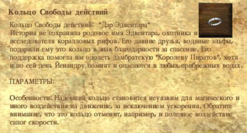 «Кольцо Свободы»?! Да неужели же наконец-то никто не сможет меня превратить в камень или удержать? Ах, только не смогут удержать, а в камень всё равно превратят? Что-что? Это кольцо попутно уничтожает эффект ускорения?! Позвольте, но ведь подобные предметы затем и создаются, чтобы никто не мог остановить или задержать быстроногого воина! А здесь – нельзя задержать, но и быстро бежать нельзя! Кто создавал подобный предмет? Самый бездарный из учеников мага? Нет уж, благодарю, такого счастья мне не надо.